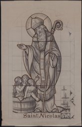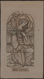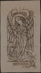 Cette maquette ne présente presque aucune différence avec le carton KF_1073 qui la suit dans le processus créatif du vitrail, si ce n’est le visage des deux anges qui sont plus poupons qu’enfantins, et les ornements décorant la tenture derrière la sainte.