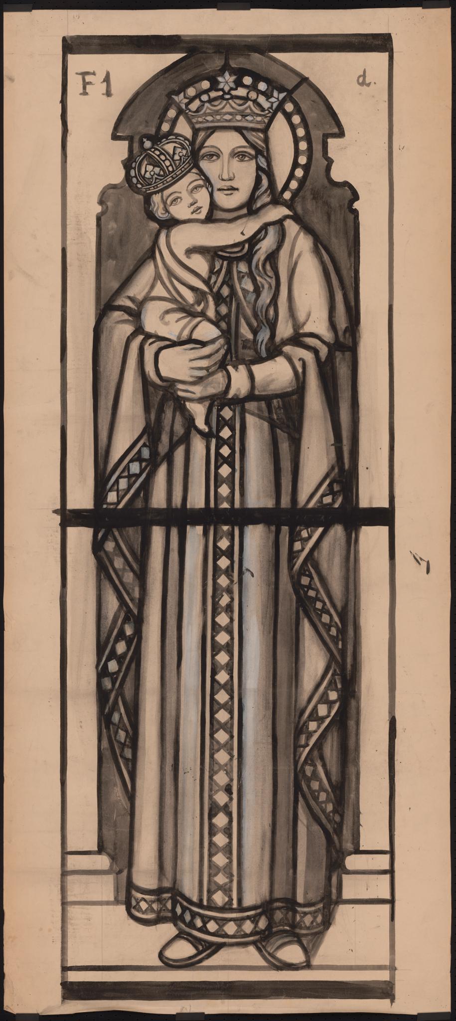 Ce carton en noir et blanc est le modèle précis à l’échelle 1:1 de la partie figurée droite du vitrail à double lancettes consacré à sainte Thérèse de Lisieux et la Vierge à l’Enfant pour la deuxième fenêtre à gauche dans la nef de l’église Saint-Jacques à Nuvilly. Le cadre ornemental fait l’objet d’un carton séparé, le KF_891, comme les ajours de réseau illustrés sur le KF_894 et le motif de la rose dans la partie ornementale inférieure de la lancette, représenté sur la partie droite du carton KF_893.