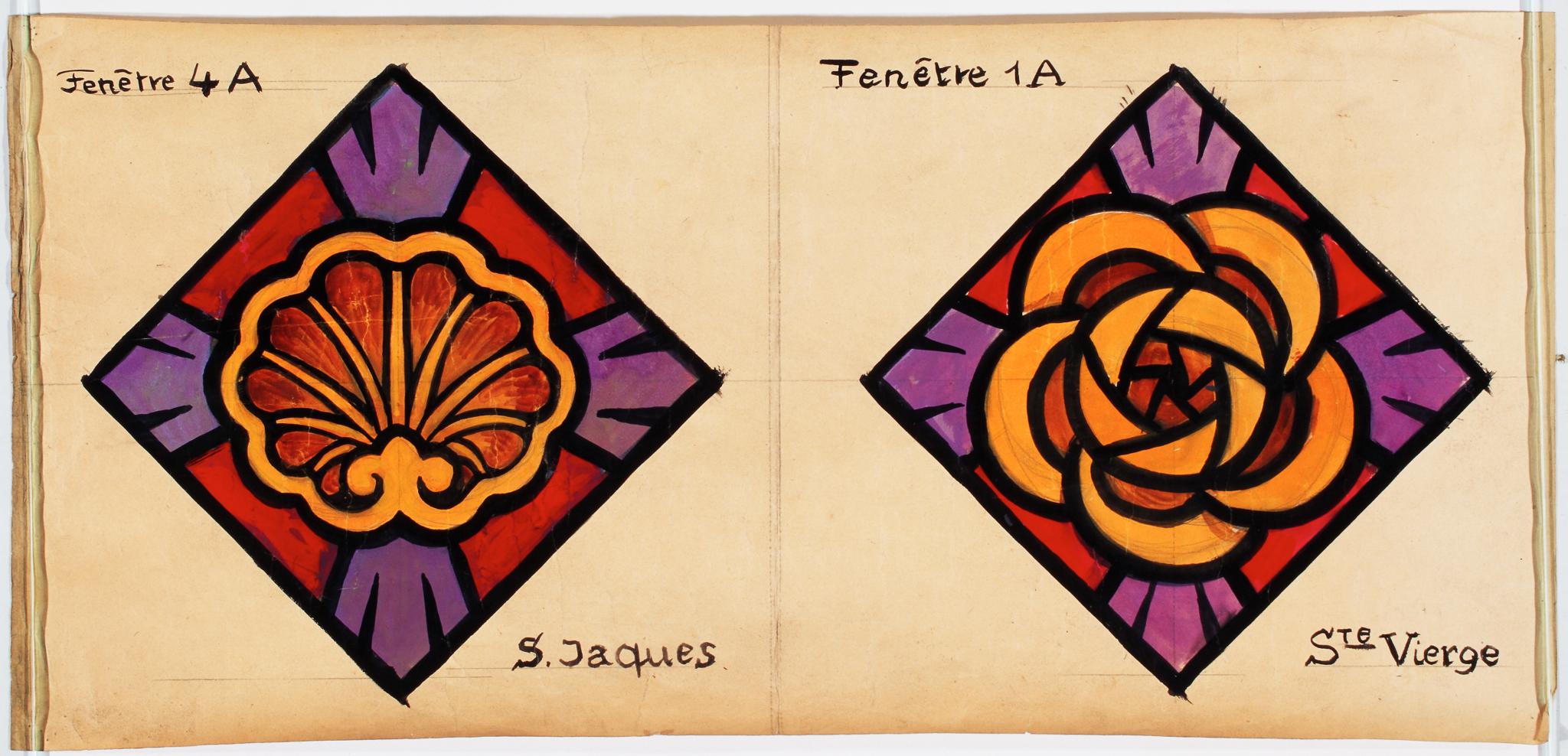 Ce carton en couleur est le modèle précis à l’échelle 1:1 des parties inférieures ornementales des vitraux à double lancettes consacrés à saint Jacques et saint Pierre Canisius (lancette de gauche) et de sainte Thérèse et la Vierge (lancette de droite) pour la nef de l’église Saint-Jacques à Nuvilly. Toute la partie ornementale autour de chaque losange manque et fait l’objet d’un détail sur le carton KF_891.