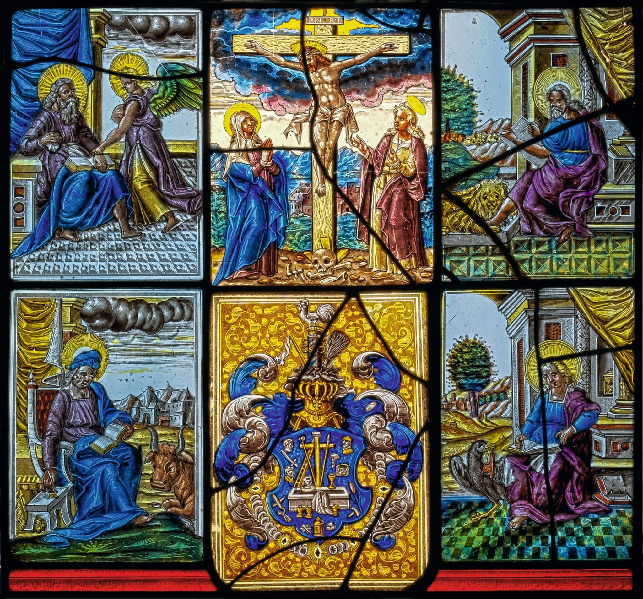 Die Scheibe ist heute in sechs Felder aufgeteilt, von denen das untere in der Mitte etwas höher und unten abgerundet ist, was darauf hindeuten dürfte, dass sich unterhalb ehemals eine Stifterinschrift anschloss. Die Darstellungen der vier im Schreiben begriffenen Evangelisten flankieren das von einer Ehrenkette umgebene Passionswappen und das Bild der Kreuzigung. Die von ihren Symbolwesen begleiteten Evangelisten sitzen jeweils über einem Fliesen- oder Rasenboden vor einem mit Vorhang dekorierten Pilaster. In der Schrifttafel des hl. Markus ist das Anfangswort "INITIV" lesbar. Im oberen Zentrum hängt Christus vor dem sich verdunkelnden Himmel am Kreuz, beseitet von der betenden Maria und dem hl. Johannes Evangelista. Im Hintergrund geht der Blick auf die am Gebirgssee liegende Stadt Jerusalem. Das Vollwappen steht in der unteren Mitte vor gelbem Rankengrund.