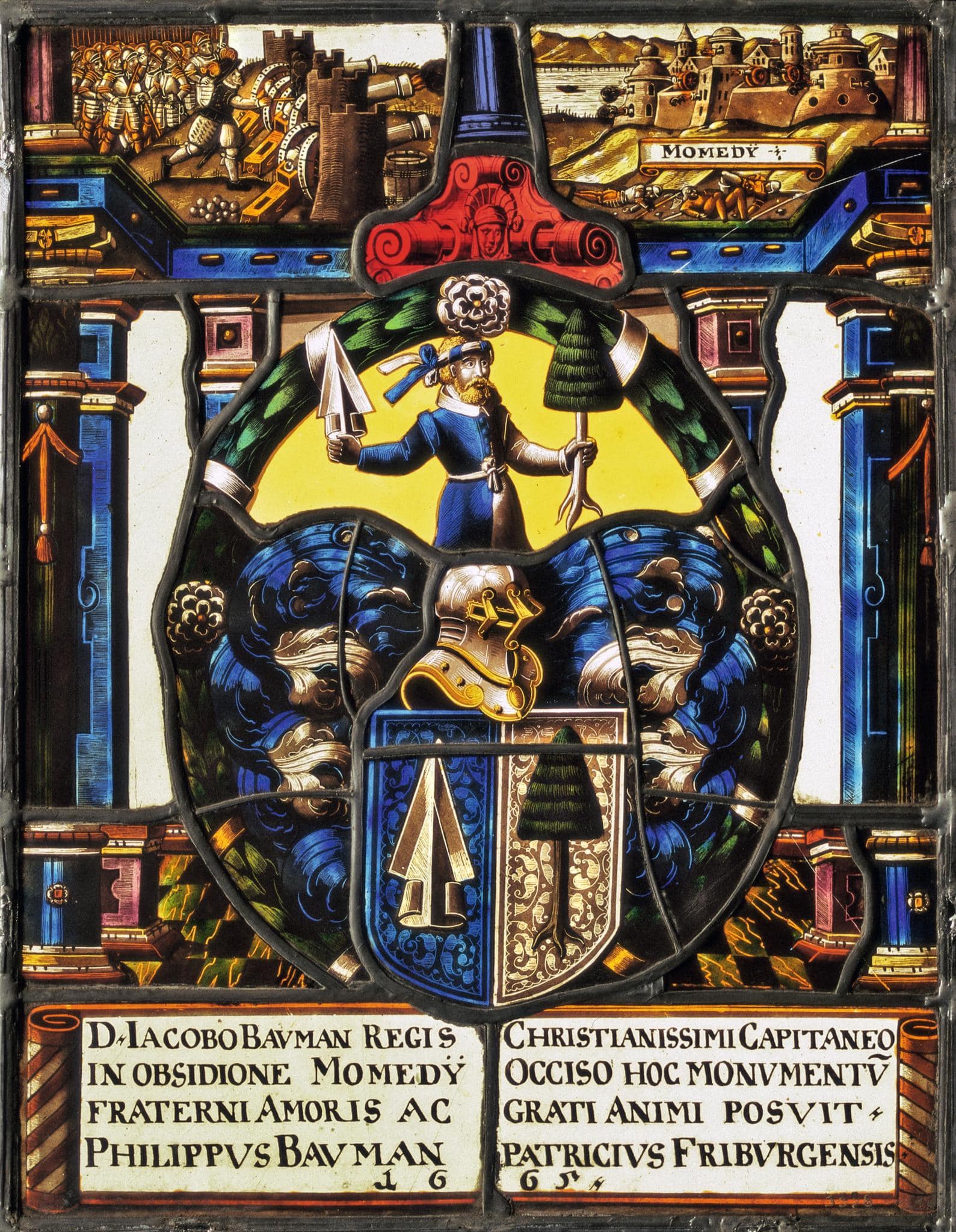 Stifterinschrift: D. Jacobo Bavman Regis Christianissimi Capitaneo / in obsidione Momedÿ occiso hoc MonvmentV̅ / fraterni Amoris ac grati Animi posvit / Philippvs Bavman patricivs Fribvrgensis/ 1665.