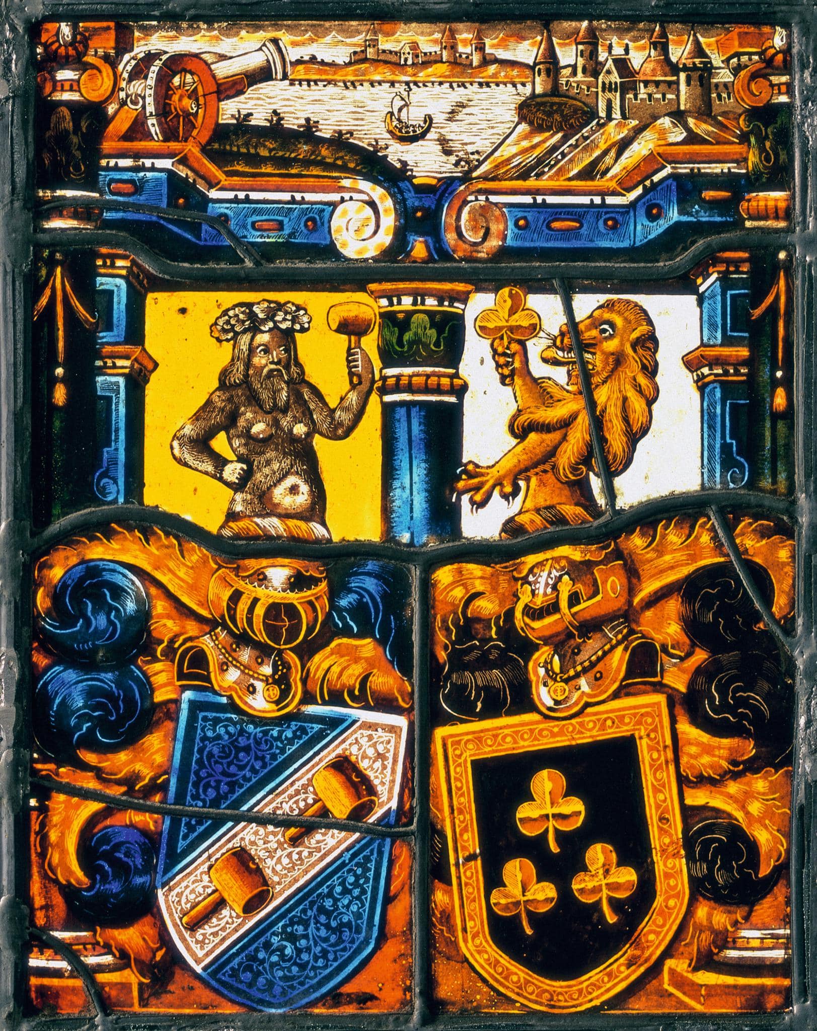 Vor einer zweiachsigen Architektur mit grünen Säulen und blauen Pilastern sowie stützender blauer Mittelsäule mit grünem Kapitell stehen die einander leicht zugeneigten Vollwappen der Stifter. Ihre Helmzierden erscheinen links vor gelbem, rechts vor farblosem Grund. Über dem verkröpften Architrav mit zentraler Volute ist zwischen den grünen Kapitellen der Rahmensäulen die Belagerung einer Ortschaft dargestellt. Die leicht auf einem Hügel erhöhte Stadt liegt an einem Gewässer, auf dem sich Schiffe nähern. Das gegenüberliegende Ufer ist ebenfalls befestigt. Am linken Bildrand ist eine Kanone auf die Stadt gerichtet. Der untere Scheibenteil mit der Inschrift fehlt.
