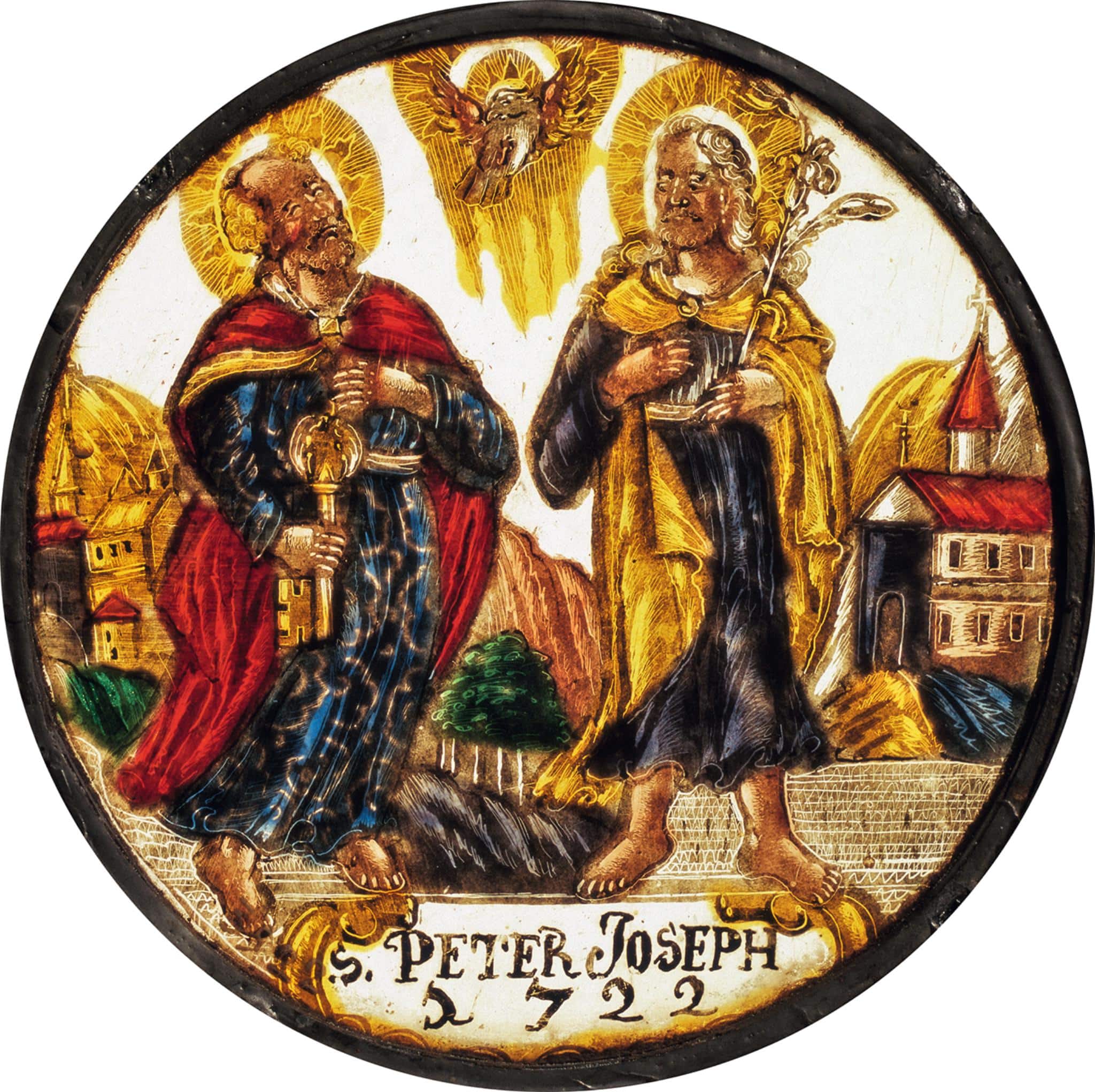 In einer gebirgigen Landschaft mit einem Dorf links und einer Kapelle rechts stehen auf Ackergrund zwei Heilige. Links ist der hl. Apostel Petrus in blau gemusterter Tunika und rotem goldgesäumtem Mantel dargestellt, den Schlüssel in der Rechten. Mit erhobenem Haupt erblickt er im Himmel die gekrönte Heiliggeisttaube. Rechts wendet sich ihm der hl. Josef zu. Er trägt eine kürzere violette Tunika und einen gelben Mantel. In der Linken hält er sein Attribut, die Lilie als Zeichen der unbefleckten Empfängnis Mariens. Zu Füssen der Heiligen nimmt eine gelbe Rollwerkkartusche die Inschrift auf.