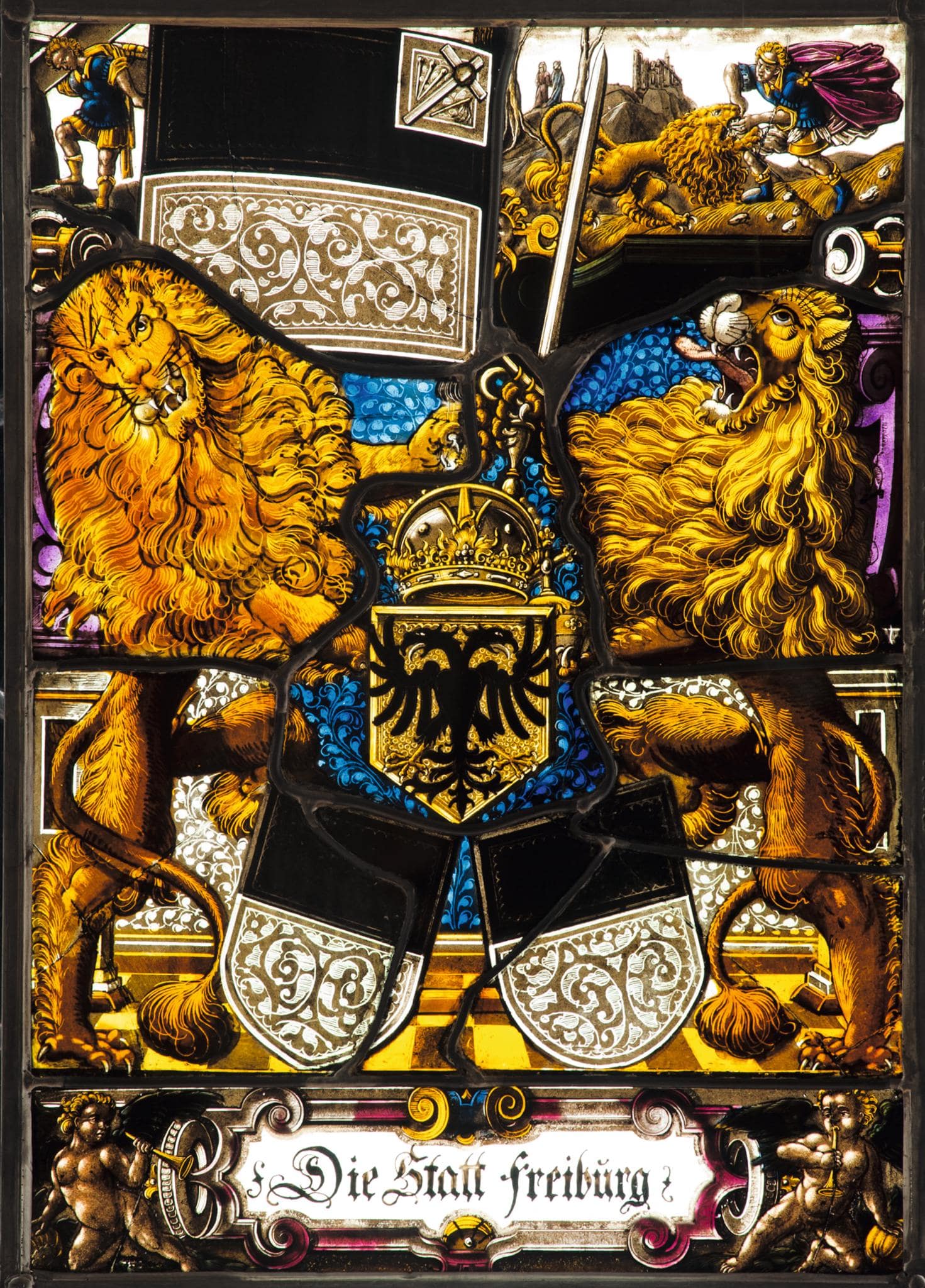 Die von der Reichskrone überhöhte Standespyramide wird von zwei Löwen flankiert, von denen der eine das Banner Freiburgs, der andere das Reichsschwert und den Reichsapfel hält. Die Oberbilder zeigen Simson als Träger der Stadttore von Gaza (Ri 16,3) sowie als Löwenbezwinger (Ri 14, 5–6.). Am Fuss steht zwischen posaunenblasenden Putten die Inschrift.