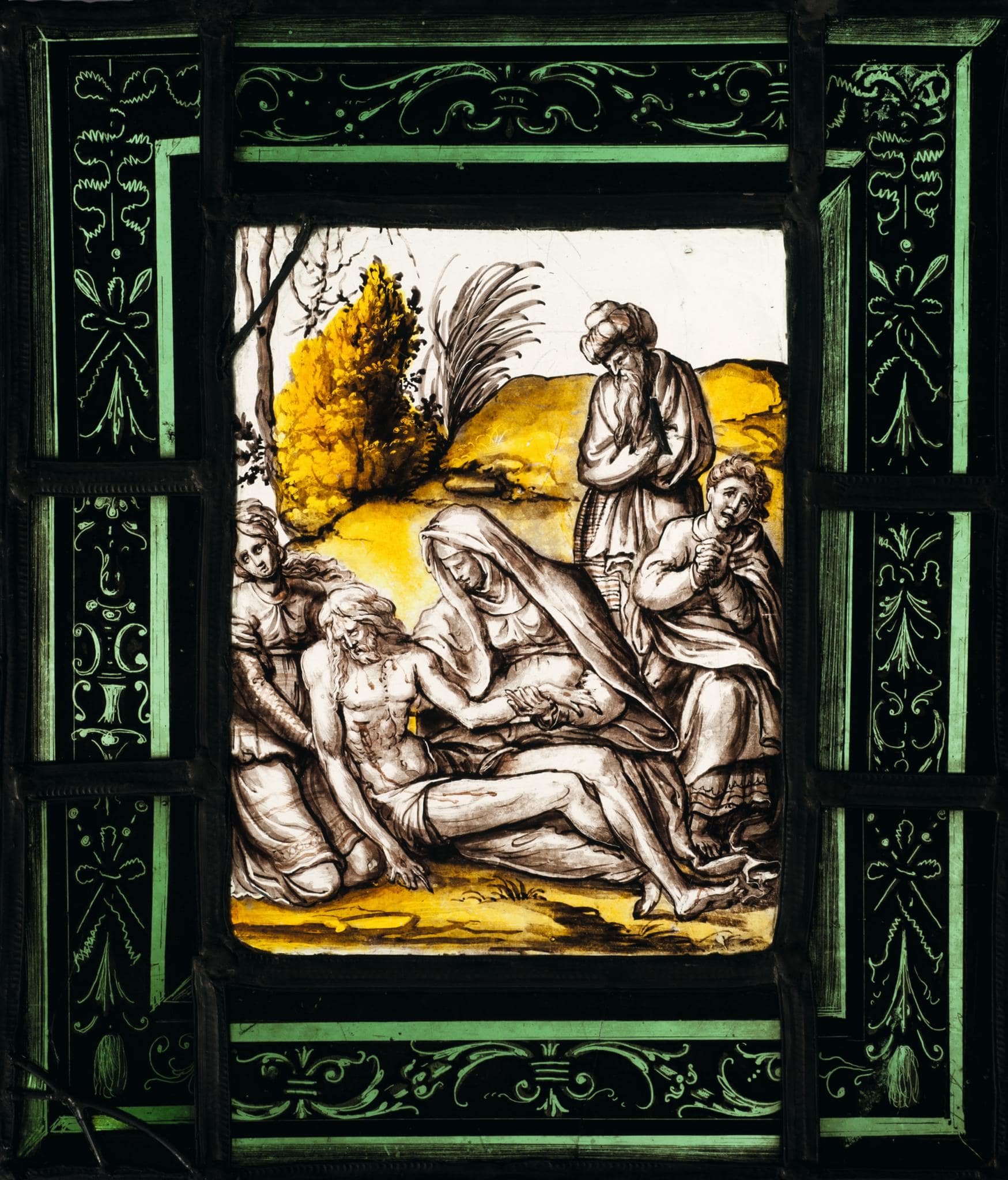 In freier Landschaft mit steigendem kahlen Gelände, das links mit einem Baum und Büschen schliesst, ist die Beweinung Christi dargestellt. Mit überkreuzten Beinen liegt der Leichnam vor dem Schoss Mariens. Seinen Oberkörper stützt kniend Maria Magdalena, die trauernd ihr Haupt abwendet. Die Gottesmutter, das Haupt mit Wimpel und Weihel verhüllt, hält den linken Arm ihres Sohnes. Während Johannes der Evangelist händeringend laut weinend neben Maria kniet, bleibt Nikodemus mit gesenktem Kopf und verschränkten Armen still im Hintergrund. Das sich auf Grisaillefarben beschränkende Bild ist von einem grünen Rahmen eingefasst, der mit ornamentalen Renaissancemotiven geschmückt ist.