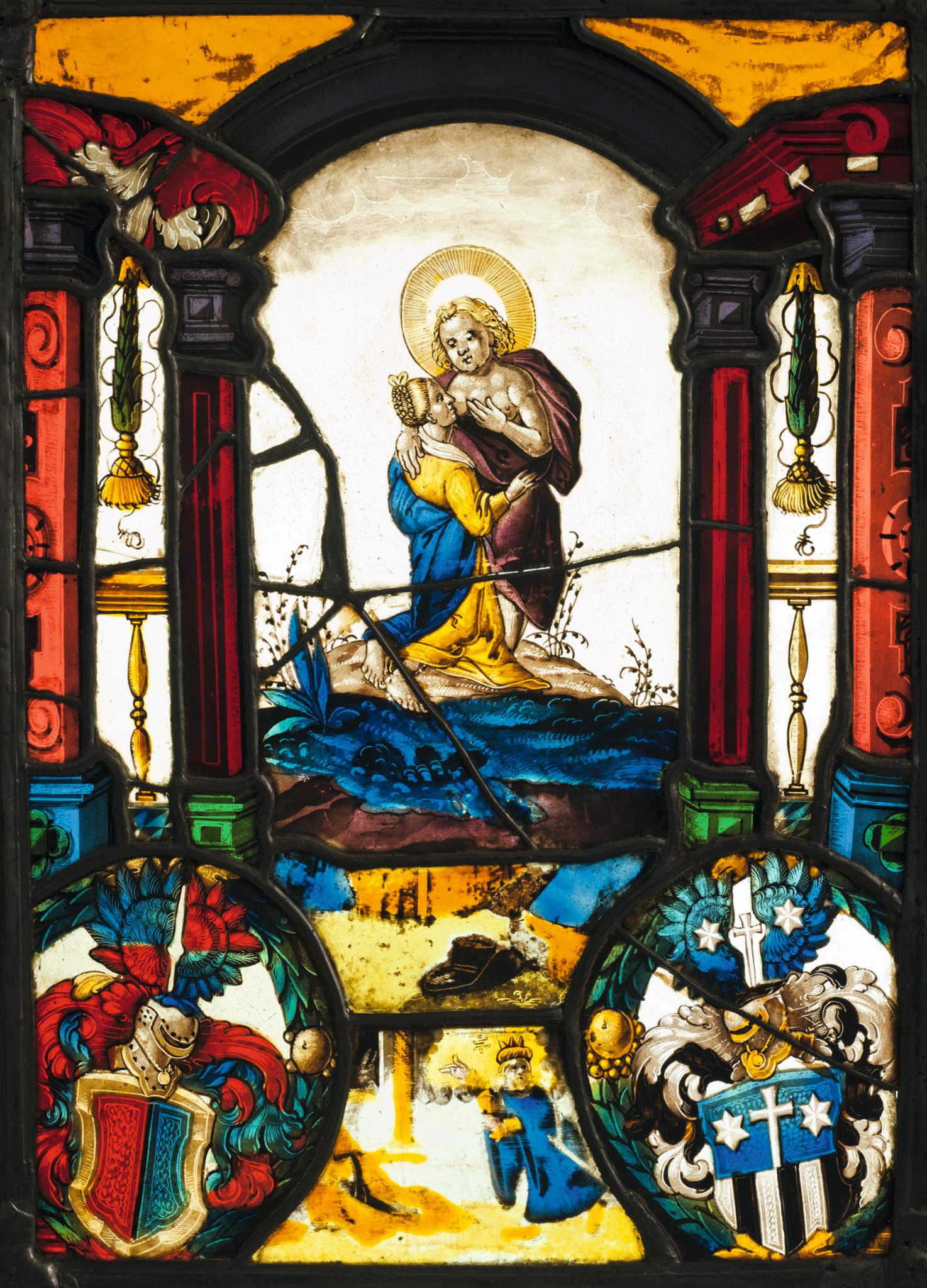 Die Darstellung des Mittelbildes ist inhaltlich komplex und kann im weitesten Sinne als “Caritas Dei” oder Liebe Gottes bezeichnet werden, die den Menschen durch Christus mitgeteilt wird (1 Jo 4, 8–9). Das Thema der Caritas erfährt hierin eine bisher einzigartige ikonographische Variation eines weit bekannteren Themas, das seit der Zeit des Humanismus als "Caritas Romana" bezeichnet wird. Dieses geht auf den römischen Schriftsteller Valerius Maximus zurück. Seine um 30 n. Chr. erschienene Anekdotensammlung "Factorum et dictorum memorabilium libri IX", eine Kompilation älterer und zeitgenössischer Quellen, war in der Antike, aber auch im Mittelalter bis ans Ende des 18. Jahrhunderts sehr beliebt, da die moralisierenden Erzählungen immer wieder beispielhaft für das gute und schlechte Verhalten der Menschheit angeführt wurden. Im Buch V, 4 beschreibt Valerius Maximus gleich zwei Begebenheiten der virtus romanae: eine eingekerkerte Mutter wird von ihrer Tochter gestillt, und der im Gefängnis schmachtende Athener Cimon wird von seiner Tochter Pero oder Pera an der Brust genährt und so vor dem Tode gerettet. Die Geschichte der barmherzigen Tochter ist auch bei Plinius d. Ä. (61/62–110) in seiner “Naturalis historia” (7, 36) bekannt und wurde in die "Gesta Romanorum" aufgenommen (Trillitzsch 1973. S. 468). Sie ist zudem von Giovanni Boccaccio (1313–1375) in seiner Historiensammlung "De claris mulieribus" wiedergegeben, wo die Tochter den Namen "Romana" führt, und findet sich dann ebenso in Cesare Ripas (um 1560–1620/25) “Iconologia” in der Ausgabe Padua 1630. Die Darstellung der "Caritas Romana" wurde vor allem im Laufe der Renaissance durch die deutschen Humanisten in ganz Europa verbreitet. Auch der mitschwingende erotische Aspekt trug zu ihrer Beliebtheit bei. Besonders die Nürnberger Kleinmeister haben zu ihrer Bekanntheit beigetragen, und Hieronymus Wierix (1553–1619) widmete diesem Thema ebenfalls einen Kupferstich (Mauquoy-Hendrickx 1978/1979. Bd. II. S. 295, Nr. 1648; Bergmann 2014. Bd. 2. Abb. 318.1). In der Antike als Symbol der Elternliebe aufgefasst, galt es bald als Bild christlicher Barmherzigkeit und Nächstenliebe, bevor es wiederum Gegenstand der Profanikonographie wurde. Die Darstellung der vorliegenden Scheibe ist in dem emblematisch angedeuteten Lactatio-Motiv und in der Ungleichheit des Paares von dem Bild der Caritas Romana sichtlich beeinflusst. Sie weicht von dem üblichen, wenngleich seltenen Motiv der Caritas als Gottesliebe mit dem Attribut des brennenden Herzens ab (RdK III, 1954. Sp. 355). Erinnerungen werden auch an mystische Hochzeiten, die sich aus den Kommentaren zum Hoheslied entwickelten, oder an die Christus-Johannes-Gruppen wach: hier ruht Johannes Evangelista an der Brust Christi (Jo 13, 23), die als Quell des Lebens (Jo 7, 37) und Evangeliums gedeutet wird (LCI 2, 1970. Sp. 308–312 [Hoheslied]; LCI 1, 1968. Sp. 454 [Christus-Johannes-Gruppe]). In einem Kölner Tafelbild um 1460 stehen der auferstandene Christus und Caritas in einer Landschaft. Caritas wird hier, laut theologischen Vorstellungen des Mittelalters zur Ecclesia, die das Blut aus der Seitenwunde auffängt (RdK III, 1954. Sp. 349–350, Abb. 4). Verschiedene Bildelemente verschmelzen offensichtlich im Bild der Scheibe zu einer neugestalteten religiösen Allegorie, zu der letztlich der Schlüssel zur genauen Deutung verlorenging.
