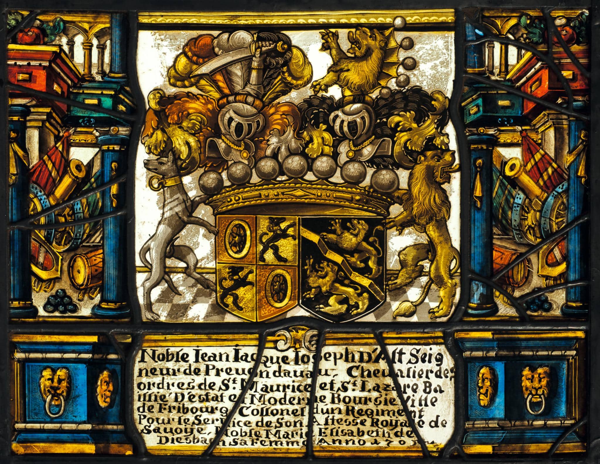 Stifterinschrift: Noble Iean Iacque Ioseph D'A[lt Seig] / neur de Preuondauau= Cheu[alier des] / ordres de St. Maurice et St. Laza[re Ba] / illie' D'estat et Moderne Boursie [Ville] / de Fribourg Collonel d'un Regime[nt] / Pour le Seruice de Son Altesse Roya[le de] Sauoÿe, Noble Marie Elisabeth de / Diesbach sa femme Anno 1705. [ergänzt]