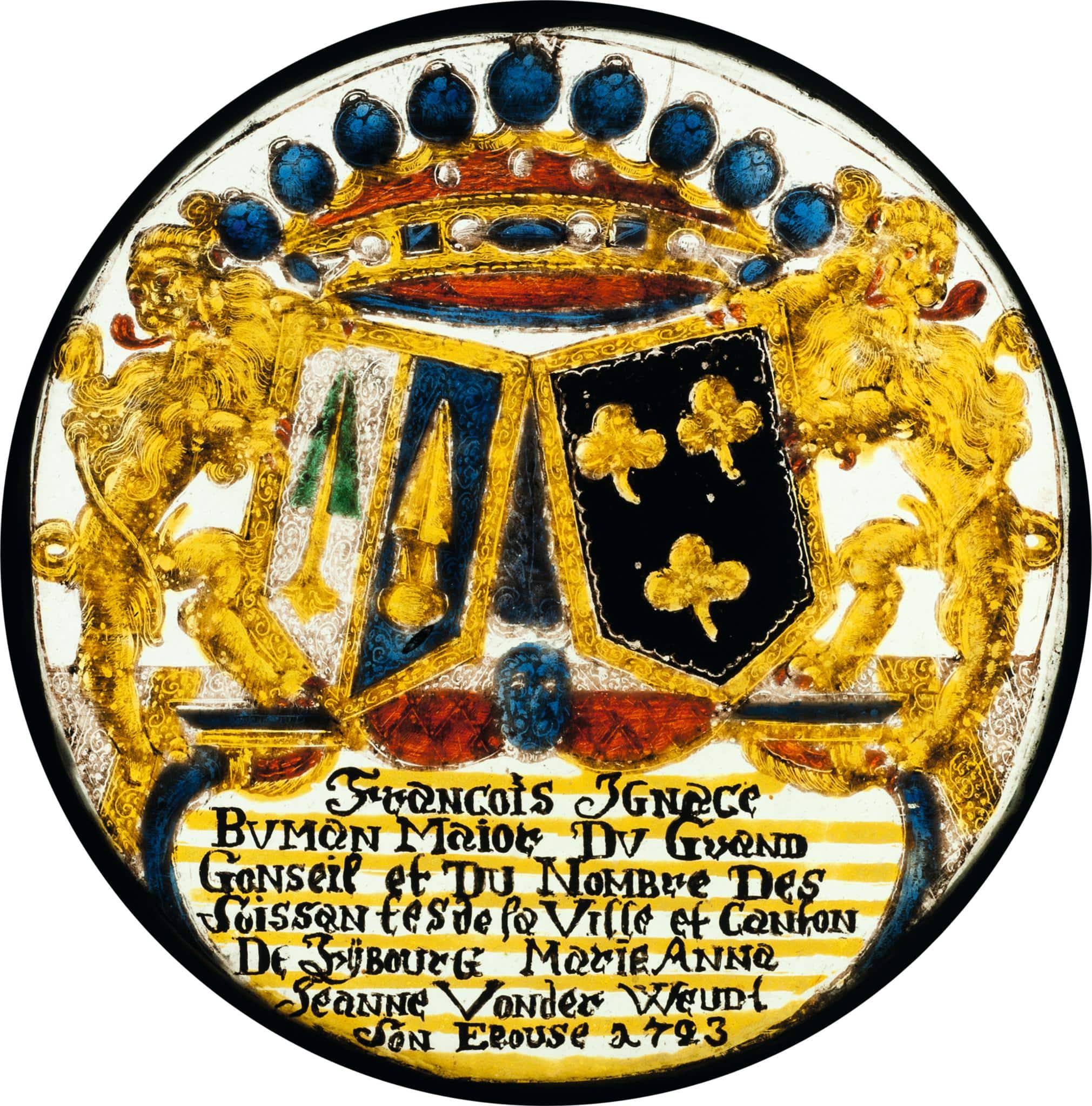 Stifterinschrift: FraNCOIS IGNaCe / BVMaN Maior DV GraND / GoNseil et DU NoMBre DeS / SoissaNtes de la Ville et CaNtoN / De FrÿBOUrG Marie ANNa / JeaNNe VoNder WeuDt / SoN Epouse 1723.