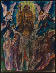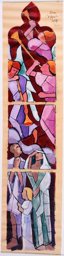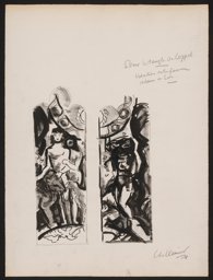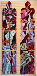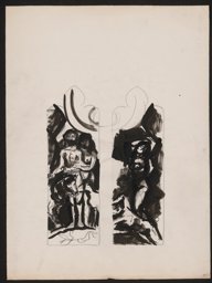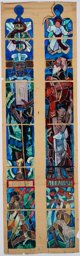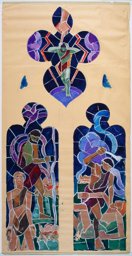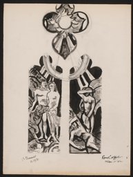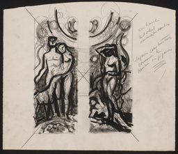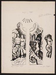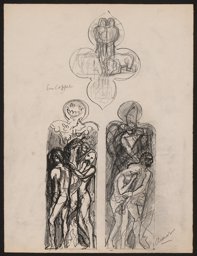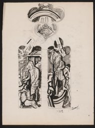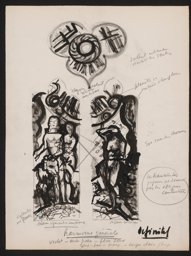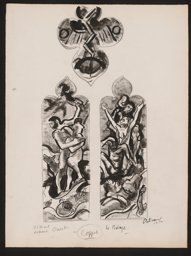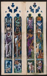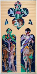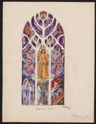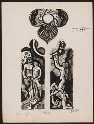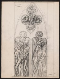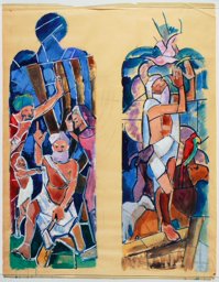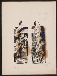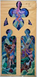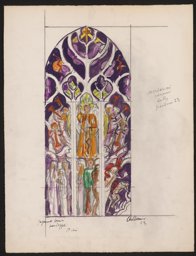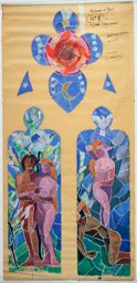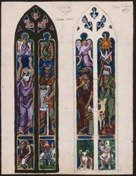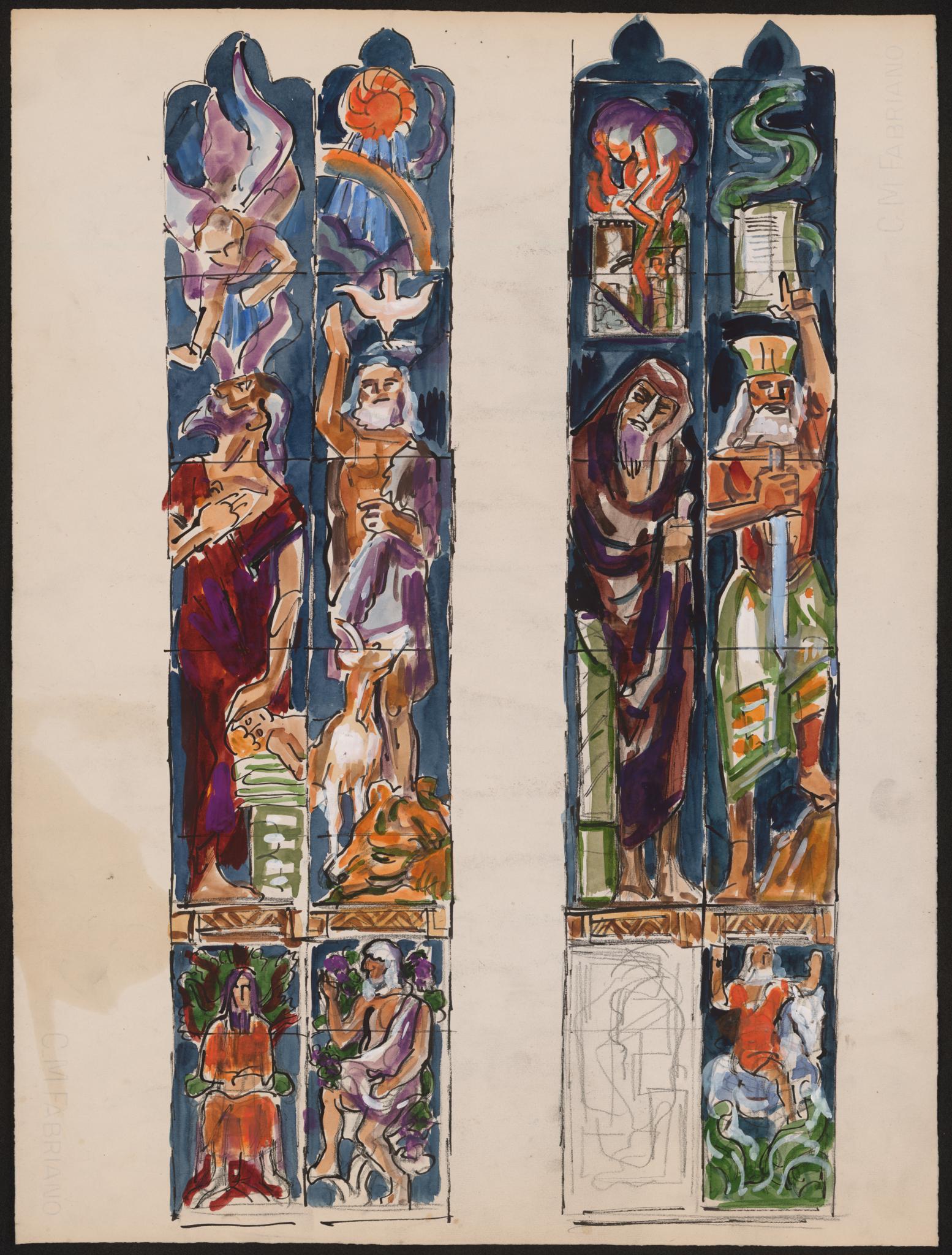 Cette maquette en couleur de deux fenêtres à double lancettes est le premier projet pour les deux verrières à droite dans le choeur du temple de Coppet. Clément a réalisé trois autres ébauches pour ces deux verrières (CHC_051 et recto de l'œuvre CHC_050), dont une en noir et blanc (au recto de CHC_052). Sur cette maquette, il place les protagonistes : Abraham et Noé sont sur la verrière de gauche alors que Jérémie et Moïse sont sur celle de droite. Alors que sur cette première esquisse l'ange au-dessus d'Abraham se penche vers lui, sur les trois autres, il est debout de face. Pour la scène inférieure, Abraham est assis sur un trône, scène reprise dans la seconde version puis abandonnée dans les deux dernières maquettes au profit du bélier. La lancette de Noé ne subit que des changements mineurs. La scène centrale de la lancette consacrée à Jérémie présente un épisode particulier de sa vie lié à la destruction des idoles. L'artiste y renoncera ensuite au profit de la présentation du prophète, de face, les bras levés au-dessus de sa tête. Moïse, à ses côtés, est dessiné sur les quatre versions de face. Alors que sur cette première esquisse il est présenté coiffé d'une toque et son bras gauche levé, montrant les Tables de la Loi, dans les trois ébauches suivantes, il tient les Tables de la Loi devant lui et les montre de son index droit.