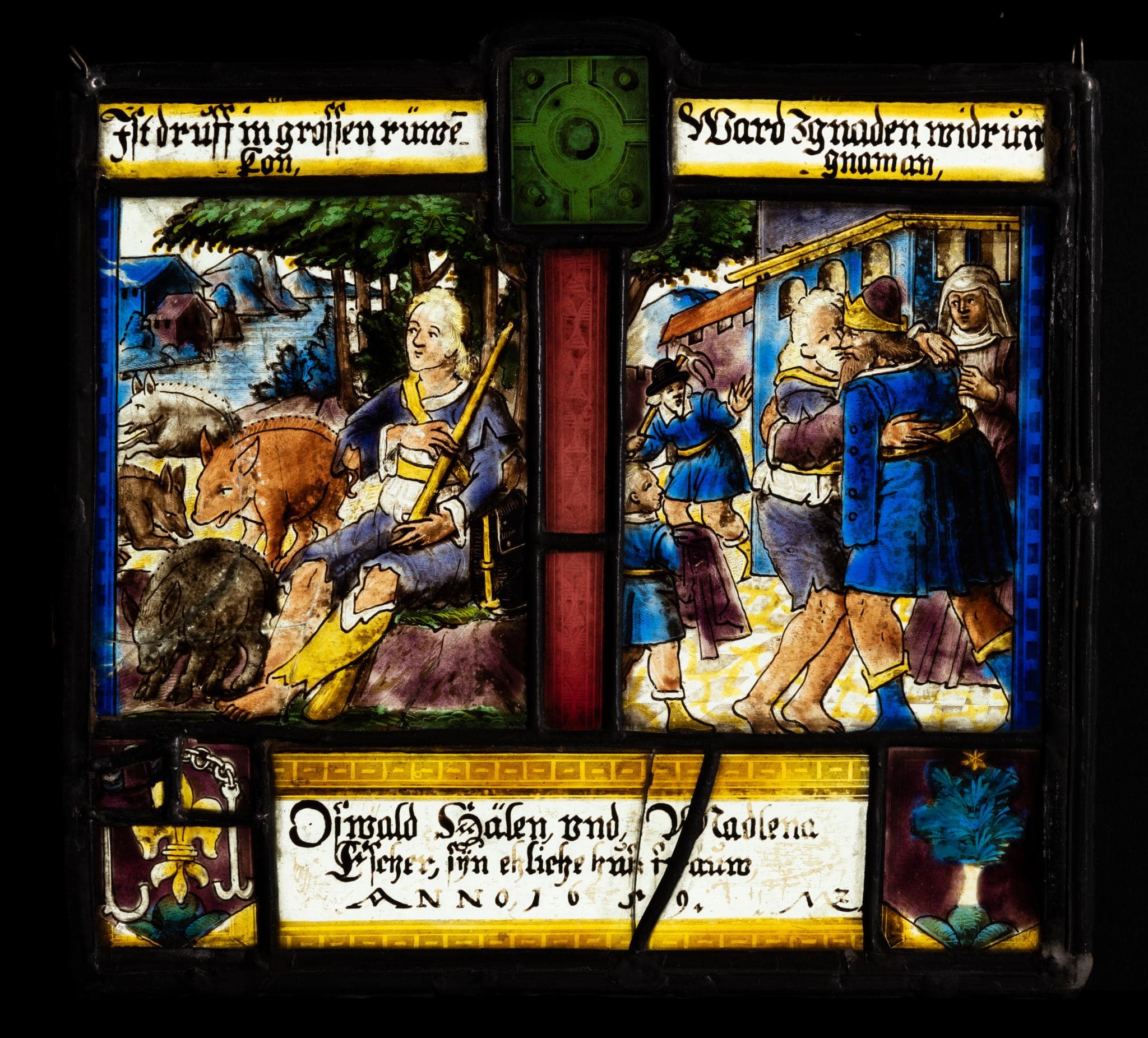 Von der Bildscheibe ist nur noch die untere Hälfte erhalten. Darauf dargestellt ist der Verlorene Sohn, der reumütig die Schweine hütet, sowie seine Rückkehr ins Elternhaus, wo er von Vater und Mutter gnadenvoll empfangen wird. Am Scheibenfuss befinden sich die Stifterinschrift sowie die Wappen Oswald Hählens (links) und Magdalena Eschers (rechts).