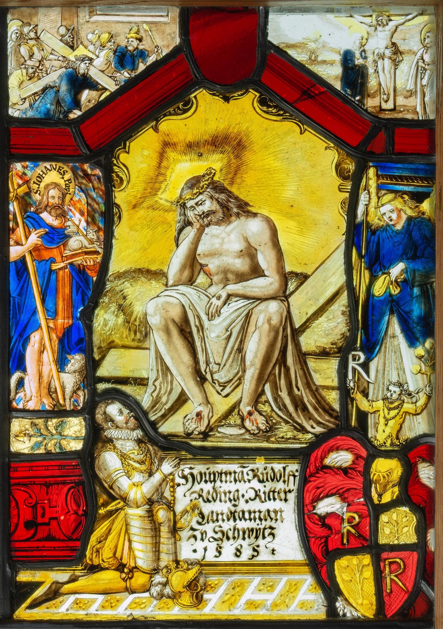 Unter einer giebelförmigen Arkade Christus im Elend vor gelbem Hintergrund. Zu seinen Füssen der auf einem Podest kniende, geharnischte Stifter, die Stifterinschrift und das Vollwappen Reding. Vor den Arkadenstützen Johannes der Täufer (links, Flickstück) und ein Engel (rechts). In den oberen Eckzwickeln Kreuztragung (links) und Christus am Kreuz (rechts).