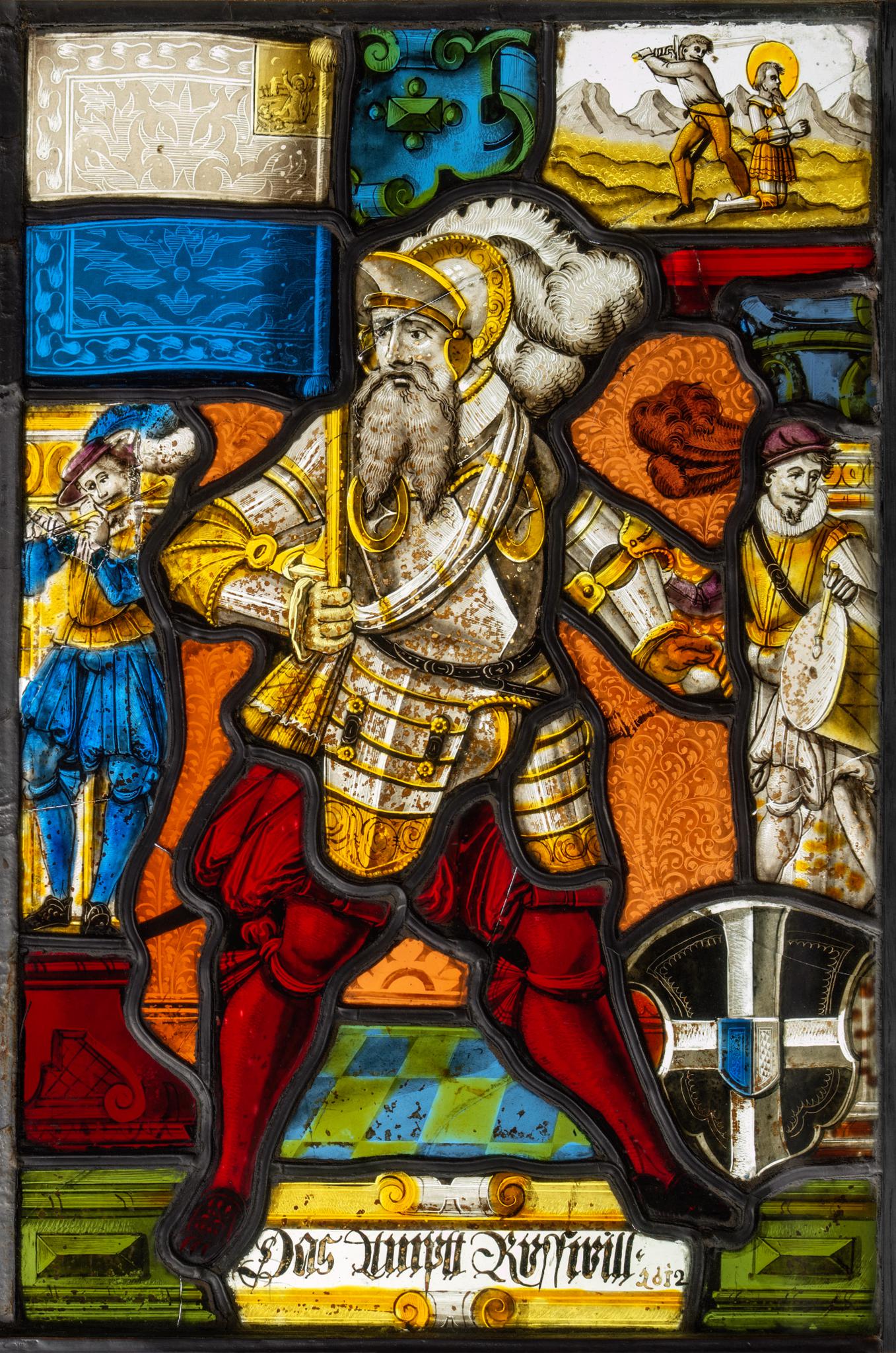 Im Zentrum der Bannerträger (Venner) im Halbharnisch mit dem Juliusbanner Luzern. Rechts neben seinen gespreizten Füssen der Wappenschild der Landvogtei Ruswil mit dem Luzerner Wappen als Herzschild. Oranger Damasthintergrund. Vor den seitlichen Stützen ein Pfeifer (links) und ein Trommler (rechts). Unten Stifterinschrift. Im rechten oberen Eckzwickel die Enthauptung des hl. Mauritius, des Patrons der Dorfkirche Ruswil.