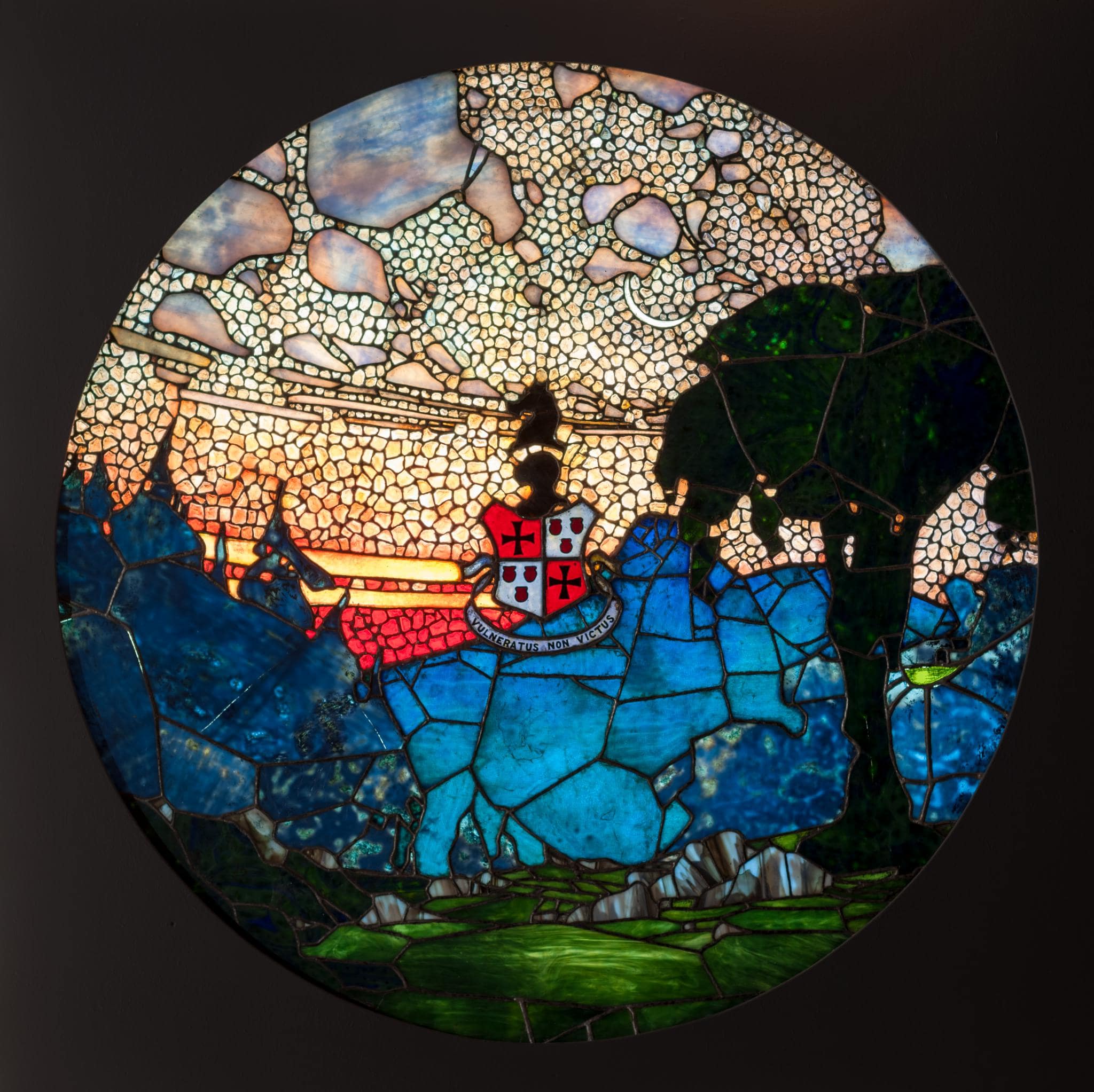 In Blei gefasste, kreisförmige Glasmalerei mit Abendlandschaft und zentralem Wappen mit Inschriftenband. Die Mondsichel erhellt die obere Hälfte des Glasgemäldes, die mittels Glasbruchstücken (broken jewels) eine reliefartige Tiefe und Bewegtheit erhält. Wiese, Felsen, Gebirge und Bäume weisen aufgrund der Verwendung von geschichtetem Farb- und Opaleszentglas eine nuancenreiche Farbigkeit auf.