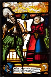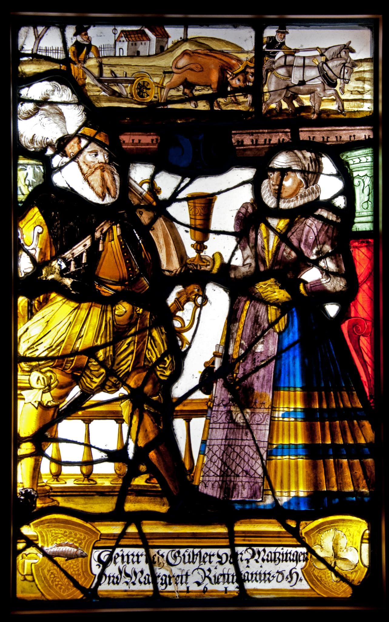 Vor farblosem Grund steht sich das Stifterpaar auf dem beschrifteten und mit den Wappen belegten Podium gegenüber. Der ein schwarzes Wams über seiner gelben Kleidung tragende Ehemann hat sein Gewehr geschultert und hält in der rechten Hand die Gabel dazu. Seine in blauem, gelb gestreiftem Rock und violetter Schürze erscheinende Gemahlin reicht ihm den Willkommtrunk in einem Pokal und hält in ihrer linken Hand die Handschuhe. Im Oberbild sind zwei mit Ochsen und Pferden pflügende Bauern dargestellt.