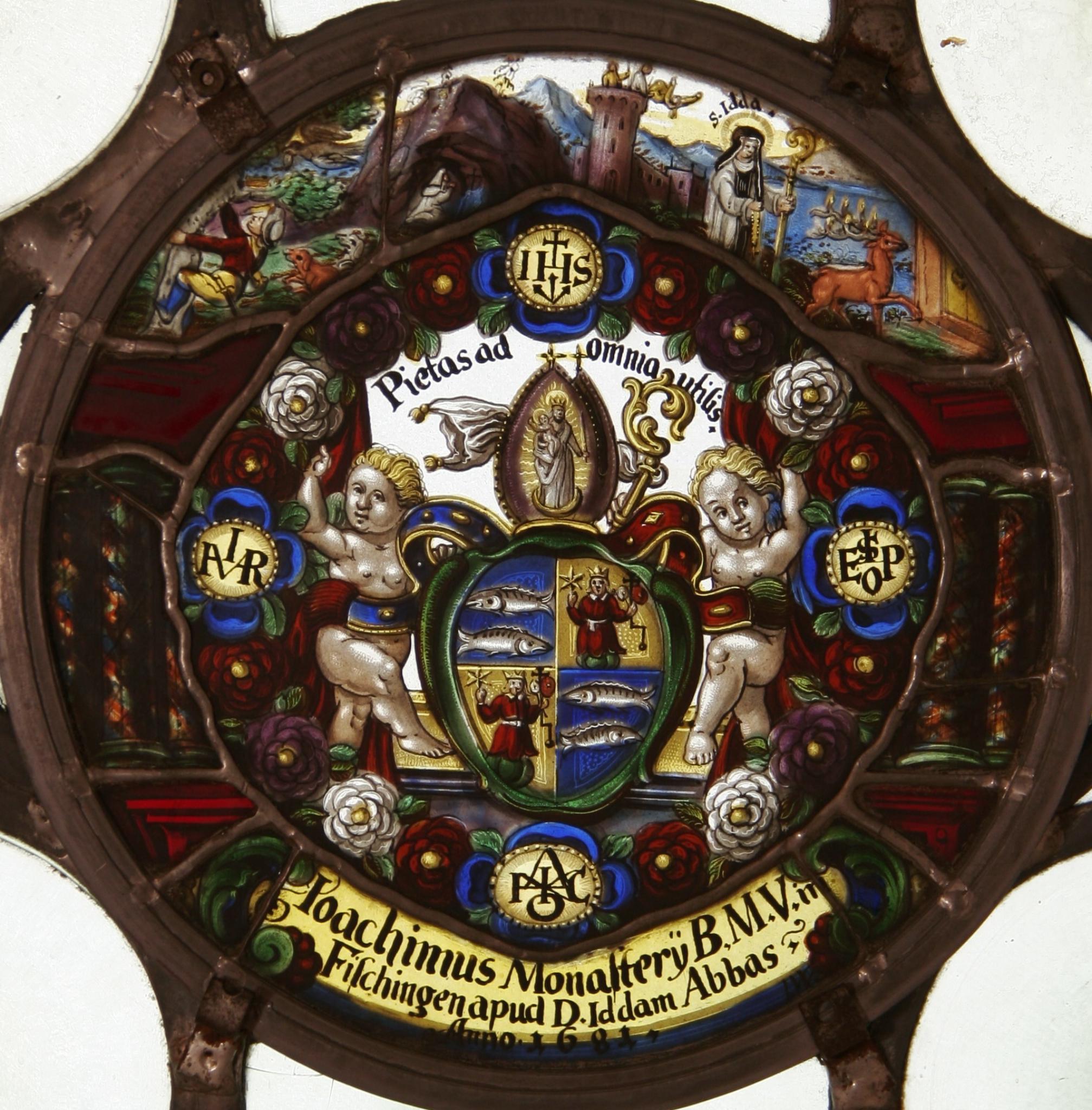 Im Jahr 1681, in welches die vorliegende Rundscheibe datiert, ist nur eine Stiftung verzeichnet, nämlich in das Kloster von Tänikon. Demnach stammt die vorliegende Scheibe des Fischinger Abtes aus Tänikon und zwar wahrscheinlich aus dem 1678 begonnenen Äbtissinnenhaus (Knoepfli, 1950, S. 356). Auf der Aktion der Sammlung Vincent 1891 befand sich nicht nur die vorliegende Scheibe sondern auch eine heute verschollene Rundscheibe der Äbtissin Viktoria von Beroldingen (1613–1687) (22,5 cm; Rahn, 1890, Nr. 372), unter deren Regentschaft das Äbtissinenhaus errichtet wurde. Sie datiert in das Jahr 1680 und ist ebenfalls von Jakob II. Weber signiert. Der Winterthurer Glasmaler schuf demzufolge mehrere Scheiben für das neue, repräsentative Klausurgebäude.