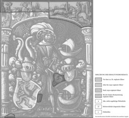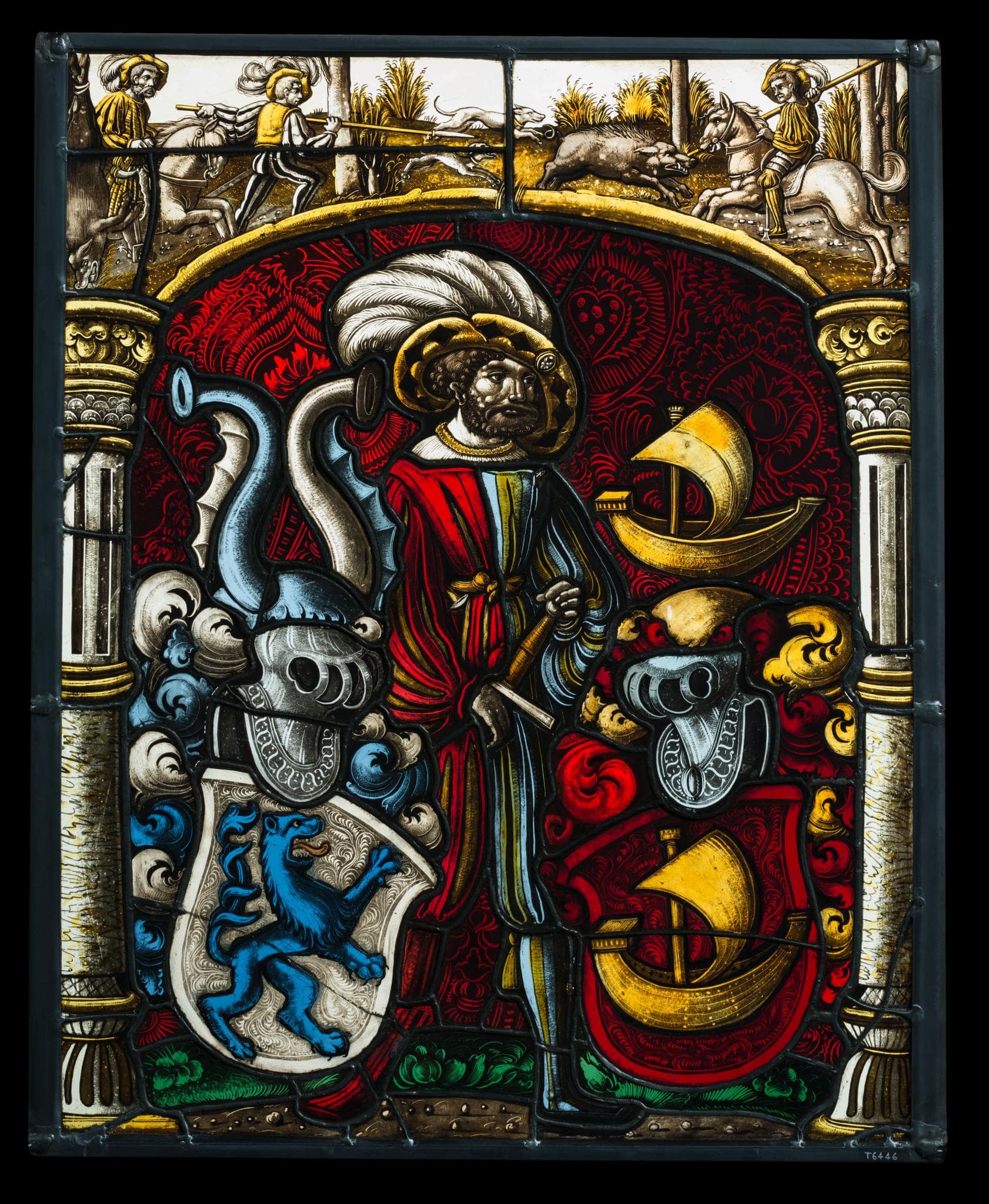 Vor rotem Damastgrund steht ein bärtiger Krieger in rot-blauer Miparti-Kleidung und gelbem Federbarett als Schildhalter zwischen den beiden Vollwappen der Stifter. Die zwei seitlichen Säulen tragen einen gelben Astwerkbogen. Darüber ist eine zu grossen Teilen erneuerte Eberjagd dargestellt.
