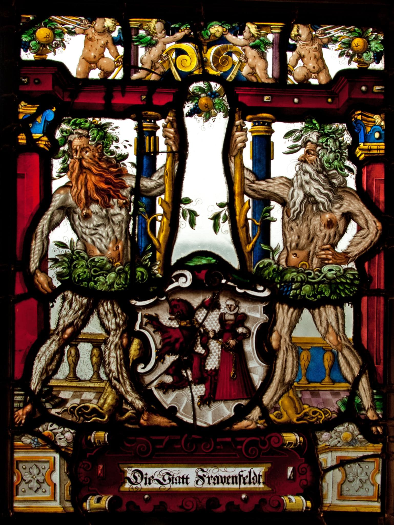 Die überlieferten Frauenfelder Stadtscheiben zeigen entweder die Gründungssage (TG_20; TG_26; TG_76) oder Schildhalter als zentrales Motiv. Die Schildhalter sind meist Engel (TG_21; TG_76; TG_42; TG_26; Scheibe von 1677, Privatbesitz, Foto Vitrocentre Romont). Wildmänner wie auf der vorliegenden Scheibe erschienen aber bereits 1533 auf einer Stadtscheibe, die ins Gemeindehaus in Unterstammheim ZH gestiftet wurde (Das Rathaus Frauenfeld, 1983, S. 38, Abb. 23).