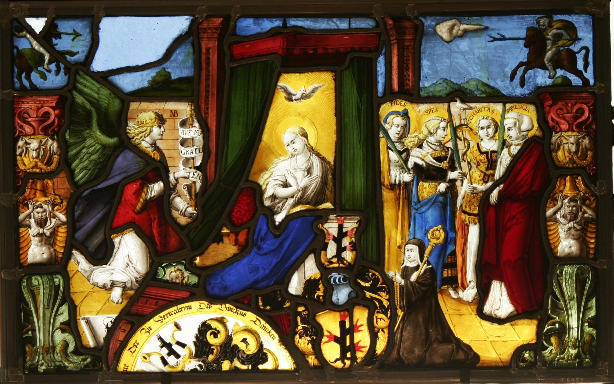 Wie die meisten der Scheiben von 1558/59 im Kreuzgang von Tänikon entstand die Scheibe in der Zürcher Werkstatt Niklaus Bluntschlis. Als Vorlage für die Verkündigungsszene diente der entsprechende Holzschnitt aus Albrecht Dürers “Marienleben” (Boesch 1943, Abb. 5). Dieselbe Dürer'sche Vorlage verwendete ein Meister aus dem Umkreis Bluntschlis auch für das Glasgemälde Sophia vom Grüths im Kloster Wettingen von 1563 und Bluntschli selbst für deren Scheibe im Museum Heylshof zu Worms von 1567.
