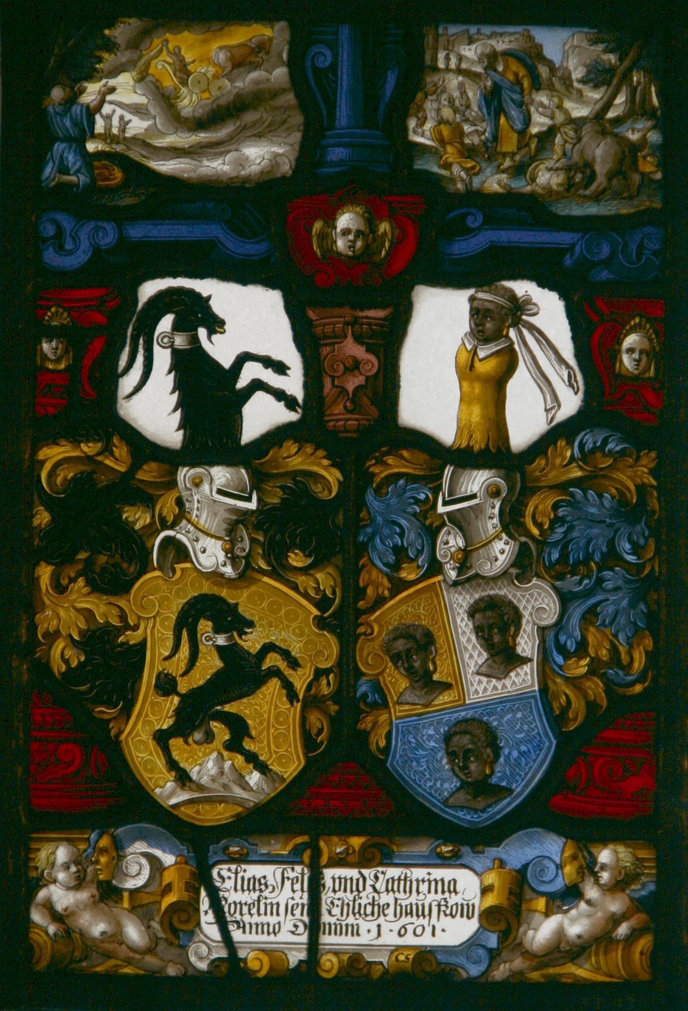 Wappen Fels, Elias: In Gold aufgerichteter schwarzer Steinbock mit silbernem Halsband auf silbernem Berg; Helm: silbern; Hemdecke: golden und schwarz; Helmzier: ein wachsender schwarzer Steinbock mit silbernem Halsband.Wappen Morell, Katharina: Geteilt, oben gespalten von Gold und Silber mit zwei “Mohrenköpfen”, unten von Blau mit einem “Mohrenkopf”; Helm: silbern; Helmdecke: golden und blau; Helmzier: ein wachsender “Mohrenrumpf” in goldenem Wams und mit silberner Stirnbinde.