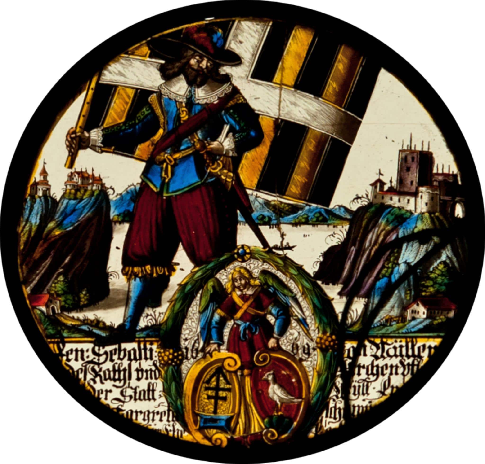 Der auf der Schrifttafel stehende, in ein blaues langärmeliges Wams, rote Pluderhosen und einen Federhut gekleidete Scheibenstifter ist in Gestalt eines Bannerträgers dargestellt. Die Fahne mit dem weissen Kreuz auf gelb und schwarz gestreiften Grund in seiner Rechten haltend, umgreift er mit der linken Hand den Griff seines am Gürtel festgebundenen Schwertes. Der Stifterinschrift zu seinen Füssen zentral aufgesetzt ist ein ovaler Lorbeerkranz, in dem ein Engel in roter Tunika die beiden Schilde mit den Wappen von Sebastian Müller und Margaretha Schobinger hält. Hinter den Figuren erscheint eine gebirgige Seelandschaft mit Städtchen und Burg auf felsigen Höhen.