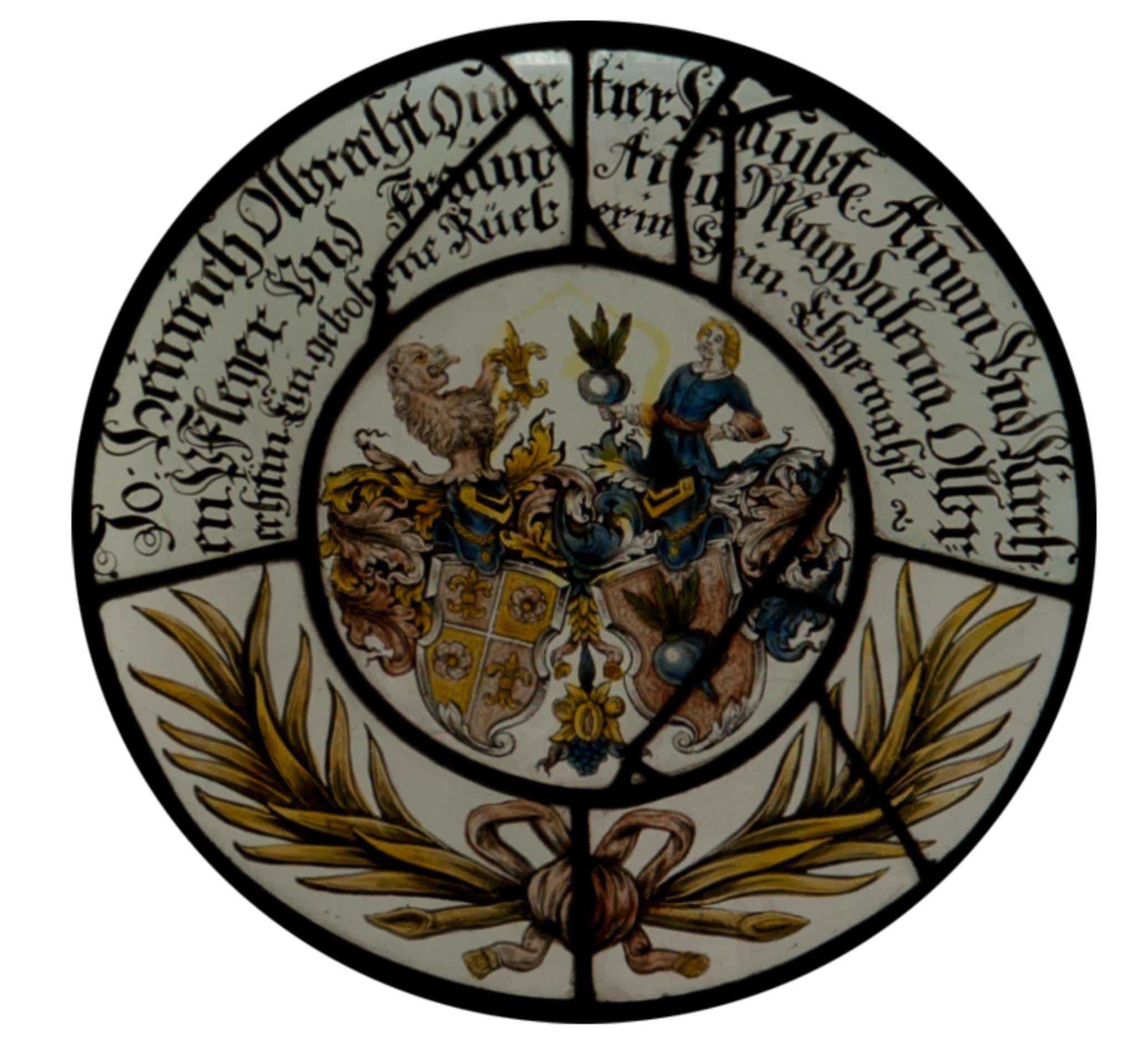 Der Zyklus für die neuerbaute Kirche von Egelshofen dürfte ursprünglich knapp zwei Dutzend Glasgemälde umfasst haben. Nach einer Beschreibung aus der Mitte des 19. Jahrhunderts waren damals die einzelnen Scheiben je zu zweit auf die in der Kirche von 1724 vorhandenen zehn Rundfenster verteilt (zwei Rundfenster an der Ost- sowie je vier an der Nord- und Südseite; vgl. Erni/Raimann, 2009, S. 204, Abb. 182, 184). Peter Erni und Alfons Raimann gehen davon aus, dass dies ihrer ursprünglichen Anordnung entsprach. Laut Hermann Strauss sollen die Glasgemälde 1724 hingegen in gleicher Weise in die beiden östlichen Chorfenster eingebaut worden sein, indem in sechs paarweise übereinander geordneten Feldern jeweils je zwei Rundscheiben oben und unten, sowie zwei viereckige Scheiben in der Mitte zur Aufstellung kamen (Strauss, 1954). Worauf sich Strauss bei dieser Angabe stützt, lässt sich seinen Ausführungen jedoch nicht entnehmen. Als die Kirche 1862 neue Fenster erhielt, wurden die zu jener Zeit noch existierenden 17 alten Glasgemälde vom Konstanzer Glasermeister Josef Ditz in den beiden Chorfenstern (Ostseite) neu zusammengestellt. Zu einer Umplatzierung kam es erneut beim Kirchenumbau von 1899. Damals wurden die Wappenscheiben vom Zürcher Glasmaler Friedrich Berbig auf die seitlichen Kirchenfenster verteilt. 1954 waren in der Kirche vom einstigen Bestand lediglich noch die elf Glasgemälde zu sehen, welche heute mehrheitlich zu Paaren vereint in die sechs modern verglasten Fenster unter der Orgelempore eingefügt sind. Von den abhanden gekommenen Werken sind insgesamt sechs bekannt. Es handelt sich um eine Scheibe der landsfriedlichen Kommission (vgl. TG_152) sowie um diejenigen von Christoph Hochreutiner (Amtsbürgermeister von St. Gallen), Hans Jakob Züblin (Bürgermeister und Reichsvogt zu St. Gallen), Georg Joachim Zollikofer von Altenklingen (Stadtschreiber von St. Gallen und Schwiegervater von Ammann Olbrechts Sohn Hans Heinrich), Johann Rudolf Albrecht aus Bern (Landammann im Thurgau) sowie um die von Hans Jakob Harder (Richter der Vogtei Eggen und Schwiegervater Johann Heinrich Olbrechts) und Johann Morell (Kirchenpfleger) gemeinsam gemachte Stiftung.