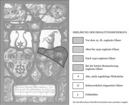 Über der voluminösen Inschriftenkartusche neigen sich die beiden Vollwappen einander leicht zu. Dahinter erheben sich vor farblosem Grund zwei rote Pfeiler und eine rote Mittelsäule, die gemeinsam ein blaues Gebälk tragen. Im Oberbild ist der links dargestellte Kampf Jakobs mit dem Engel ein altes Flickstück. Ursprünglich befand sich hier die Figur Mariens, zu welcher der von einer Gloriole umfasste Verkündigungsengel Gabriel von der anderen Seite heraneilt.