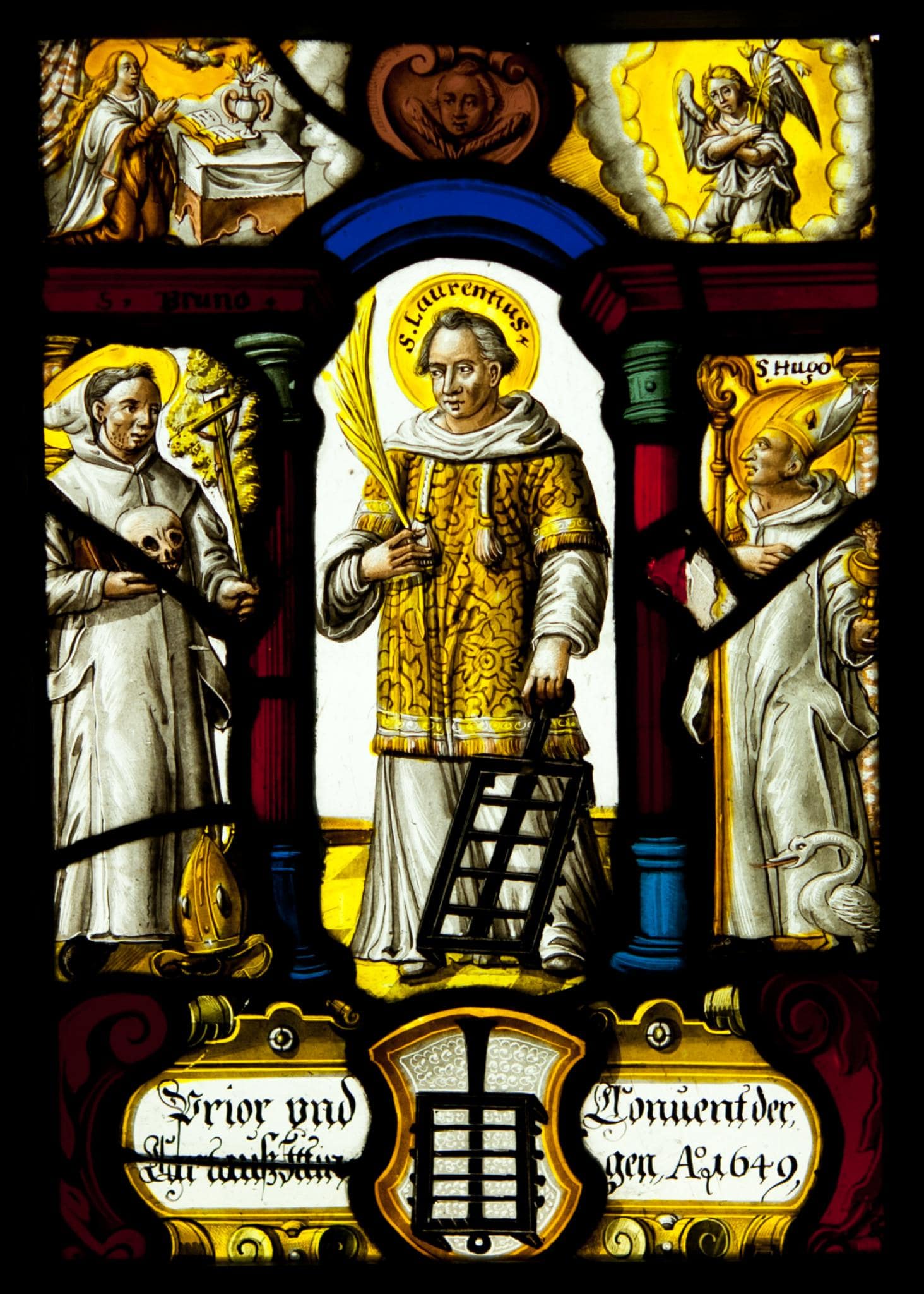 11H(LAURENCE) · Laurentius von Rom, Märtyrer und Diakon; mögliche Attribute: Buch, Weihrauchgefäß, Kreuz, Dalmatika, Bratrost, Palme, Geldbörse (oder Kelch mit goldenen Münzen)