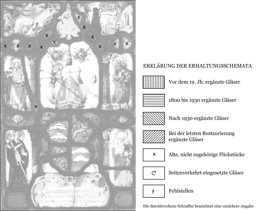 S IOHANES TOVF / S IOH[ANE]S EV / S B[ENE]DICTVS / S ANNA (in eckigen Klammern die nicht mehr vorhandenen bzw. durch die Verbleiung verdeckten Buchstaben)