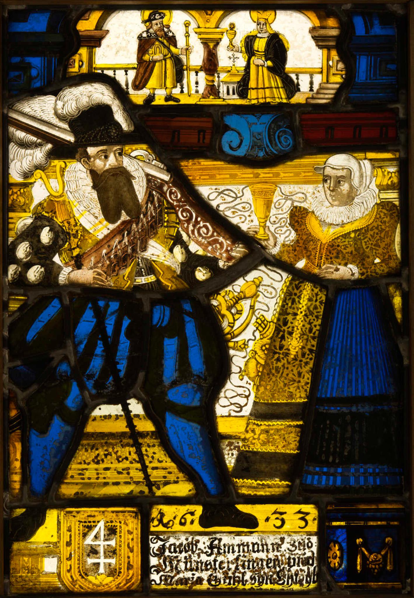 Vor farblosem, schnurverziertem Grund steht sich das Stifterehepaar gegenüber. Der einen Degen am Gürtel tragende, in der rechten Hand sein Amtszeichen, einen Weibel- oder Gerichtsstab, haltende Mann in blau-schwarz gestreiften Pluderhosen, braunem Wams sowie schwarzem Hemd und Federhut hat sein Gewehr geschultert und das Patronenbandelier um die Brust gebunden. Seine Gemahlin in blauem Rock, brauner Schürze und weisser Haube reicht ihm den Becher mit dem Willkommtrunk entgegen. Oberhalb des roten Gebälks erscheinen unter einer Doppelarkade zwei Heilige. Bei der männlichen Figur handelt es sich um Jakobus den Älteren, den Namenspatron des Stifters. Die weibliche Heilige ist als hl. Barbara mit dem Hostienkelch zu identifizieren. Das Kirchenmodell zu ihren Füssen ist wohl als Turm zu deuten. In der Fusszone sind dessen Wappen und die Stifterinschrift festgehalten. Anstelle des Flickstücks dürfte in der Ecke unten rechts zudem ursprünglich das Wappen von Maria Guhl eingefügt gewesen sein.