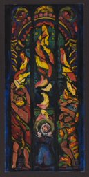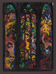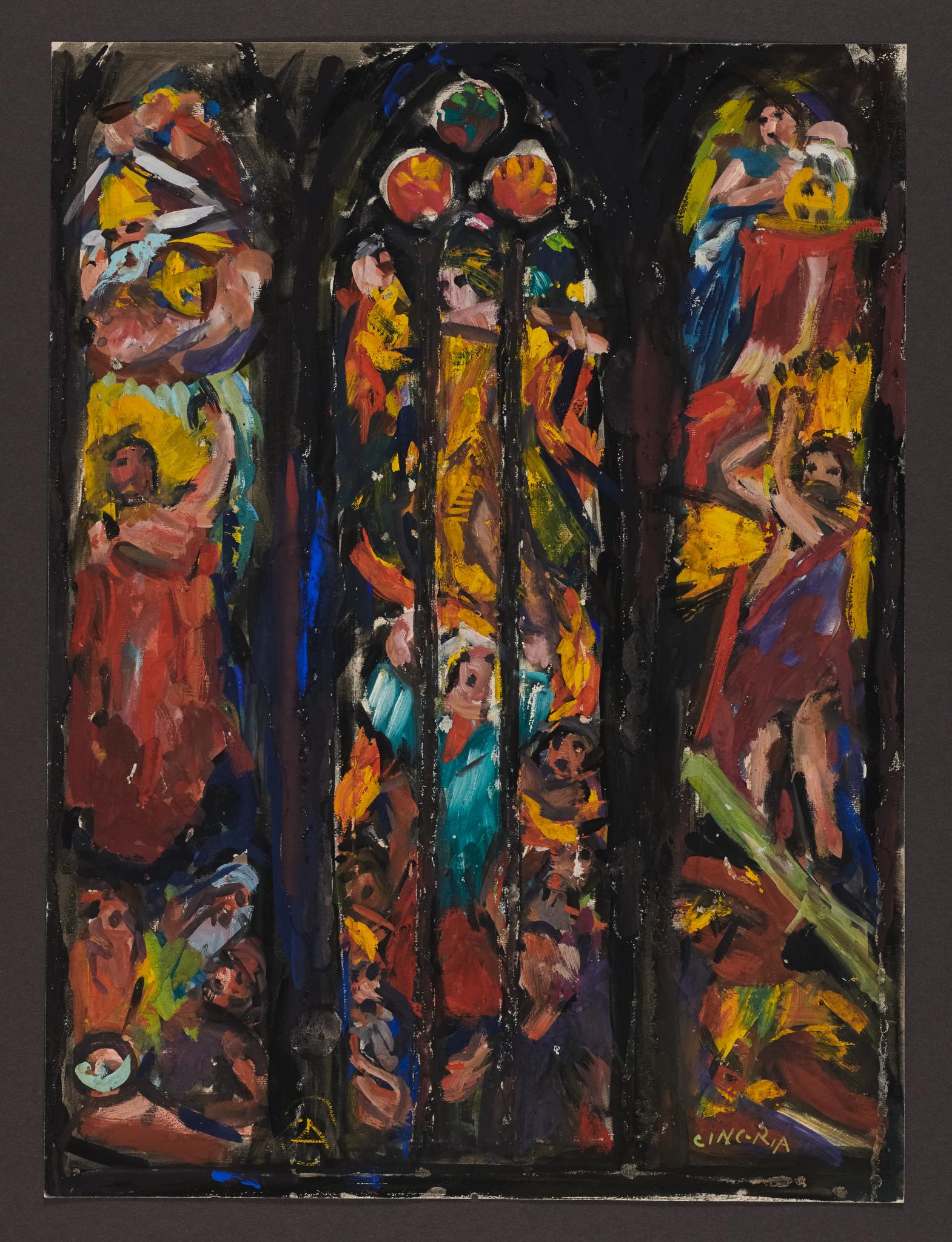 Étude préparatoire colorée d’Alexandre Cingria pour les trois fenêtres du chœur de l’église du Couvent des Cordeliers à Fribourg. Le projet illustre trois moments postérieurs à la Passion, de gauche à droite : la Résurrection, la Pentecôte et l’Ascension.