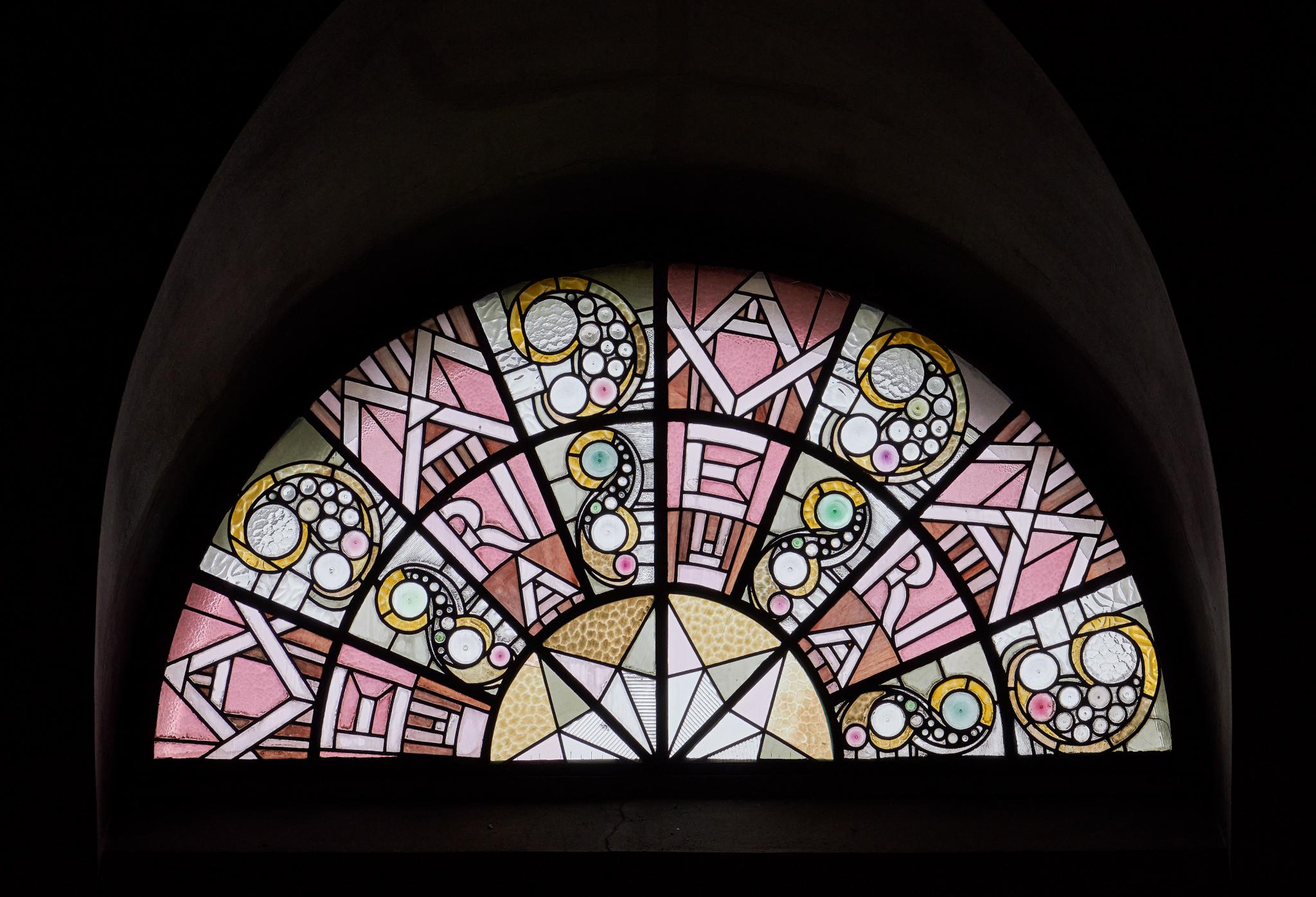 Même s’il ne s’agit pas de vitraux figurés, ces six lunettes de la nef aux motifs identiques sont d’une grande complexité. Au niveau technique, ces verrières présentent une très grande variété de verres, de différentes structures et degrés de translucidité, filtrant la lumière et transformant sans doute considérablement l’atmosphère lumineuse de la nef par rapport à la première église néo-classique du XIXème siècle d’Henri Perregaux. Cette richesse des matériaux est un aspect typique des réalisations de Cingria. Sa collaboration avec l’atelier Chiara, qui possède un grand stock de verres du début du siècle utilisés jusqu’alors plutôt dans le cadre civil (pour des cages d’escalier, appartements, salles de bain), lui permet de libérer son potentiel créatif en mettant les matériaux au service de son expression artistique.