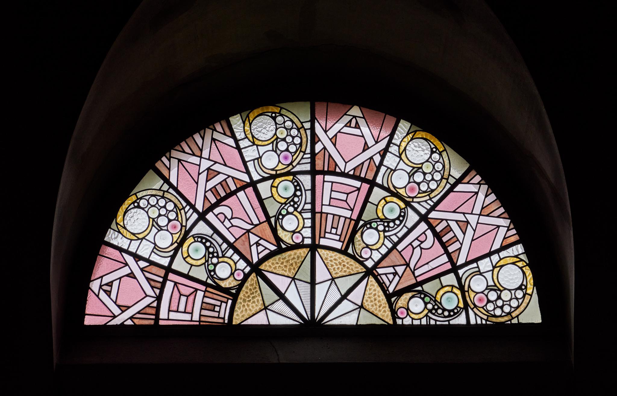 Même s’il ne s’agit pas de vitraux figurés, ces six lunettes de la nef aux motifs identiques sont d’une grande complexité. Au niveau technique, ces verrières présentent une très grande variété de verres, de différentes structures et degrés de translucidité, filtrant la lumière et transformant sans doute considérablement l’atmosphère lumineuse de la nef par rapport à la première église néo-classique du XIXème siècle d’Henri Perregaux. Cette richesse des matériaux est un aspect typique des réalisations de Cingria. Sa collaboration avec l’atelier Chiara, qui possède un grand stock de verres du début du siècle utilisés jusqu’alors plutôt dans le cadre civil (pour des cages d’escalier, appartements, salles de bain), lui permet de libérer son potentiel créatif en mettant les matériaux au service de son expression artistique.