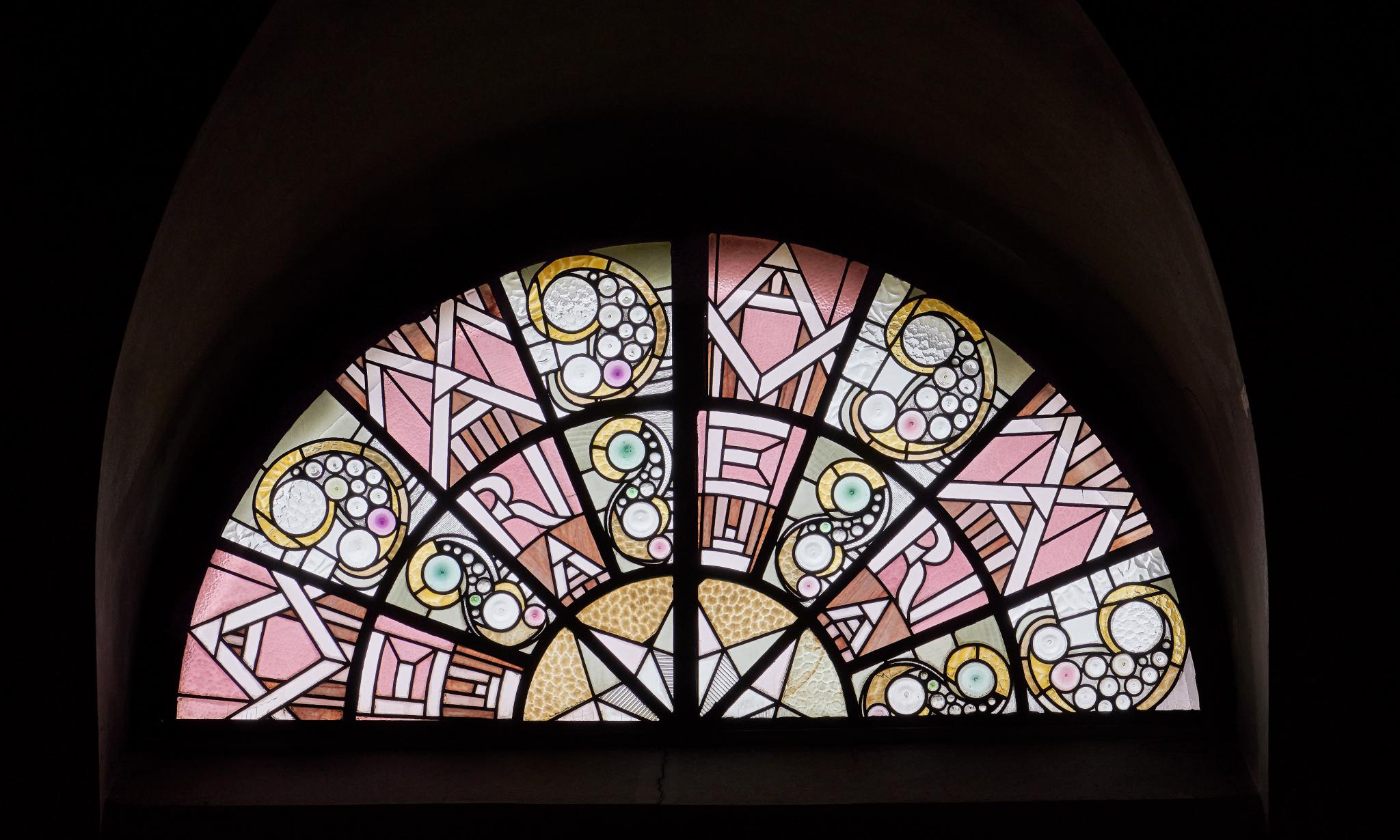 Même s’il ne s’agit pas de vitraux figurés, ces six lunettes de la nef aux motifs identiques sont d’une grande complexité. Au niveau technique, ces verrières présentent une très grande variété de verres, de différentes structures et degrés de translucidité, filtrant la lumière et transformant sans doute considérablement l’atmosphère lumineuse de la nef par rapport à la première église néo-classique du XIXème siècle d’Henri Perregaux. Cette richesse des matériaux est un aspect typique des réalisations de Cingria. Sa collaboration avec l’atelier Chiara, qui possède un grand stock de verres du début du siècle utilisés jusqu’alors plutôt dans le cadre civil (pour des cages d’escalier, appartements, salles de bain), lui permet de libérer son potentiel créatif en mettant les matériaux au service de son expression artistique.