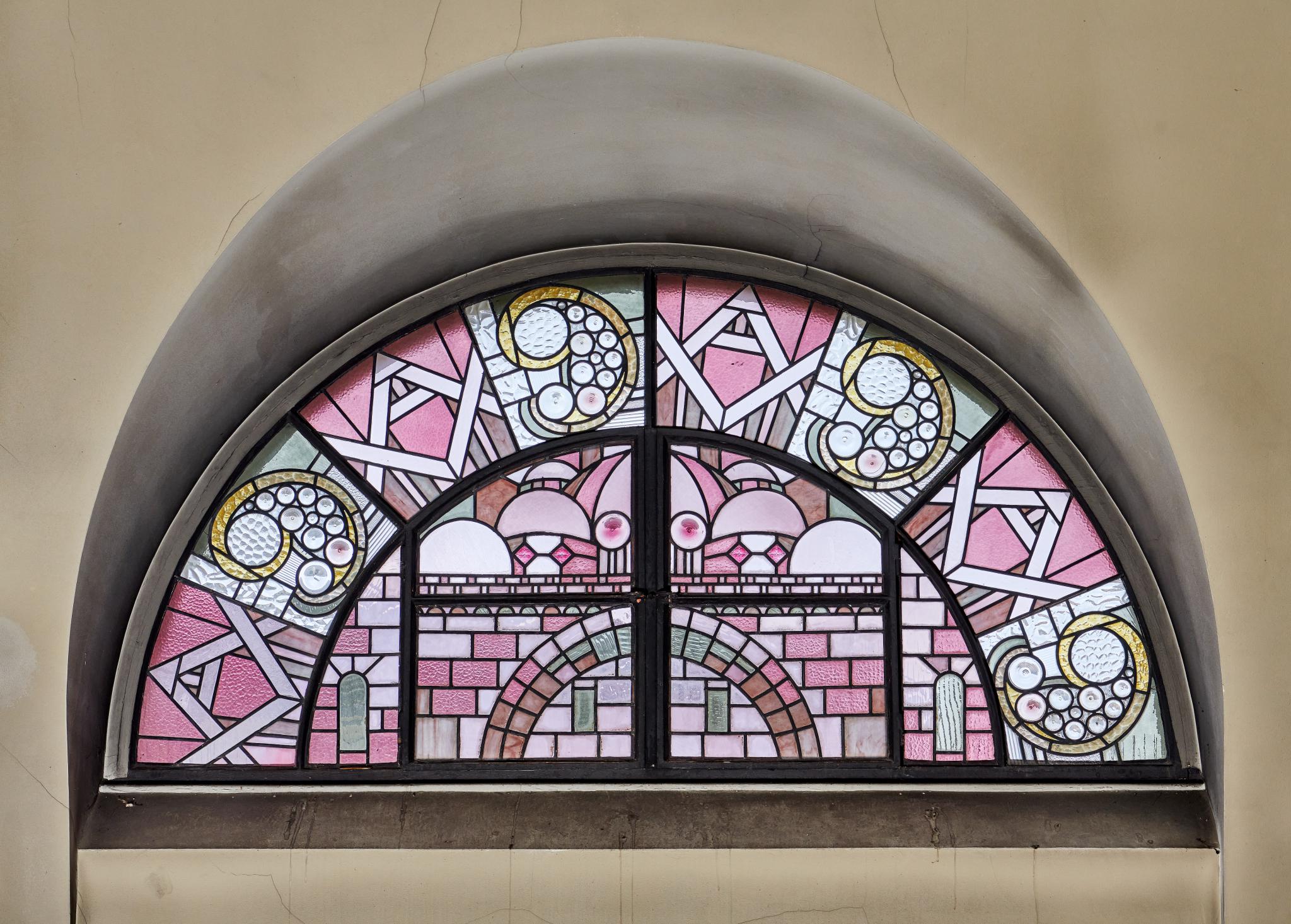 Au centre de la lunette, dans un demi-cercle délimité par l’armature métallique du vitrail, une ville est représentée, protégée par un grand mur d’enceinte en maçonnerie au premier plan, percé de petites fenêtres et traversé par un grand arc, au-delà duquel se devine un palais ou temple majestueux avec un grand dôme central entouré de plusieurs petits dômes. La large bordure qui entoure ce motif central de ville est divisée en huit sections alternant entre une inscription, un “A” entrecroisé avec un “V”, et un motif ornemental sinueux à l’intérieur duquel sont répartis plusieurs cercles de différentes tailles. La ville est traitée dans des tons roses pastel similaires aux parties avec les inscriptions, tandis que les motifs ornementaux présentent des teintes plus claires et se détachent sur un fond presque blanc. Ce vitrail est constitué d’une grande variété de verres présentant des structures diverses et une translucidité plus ou moins forte.
