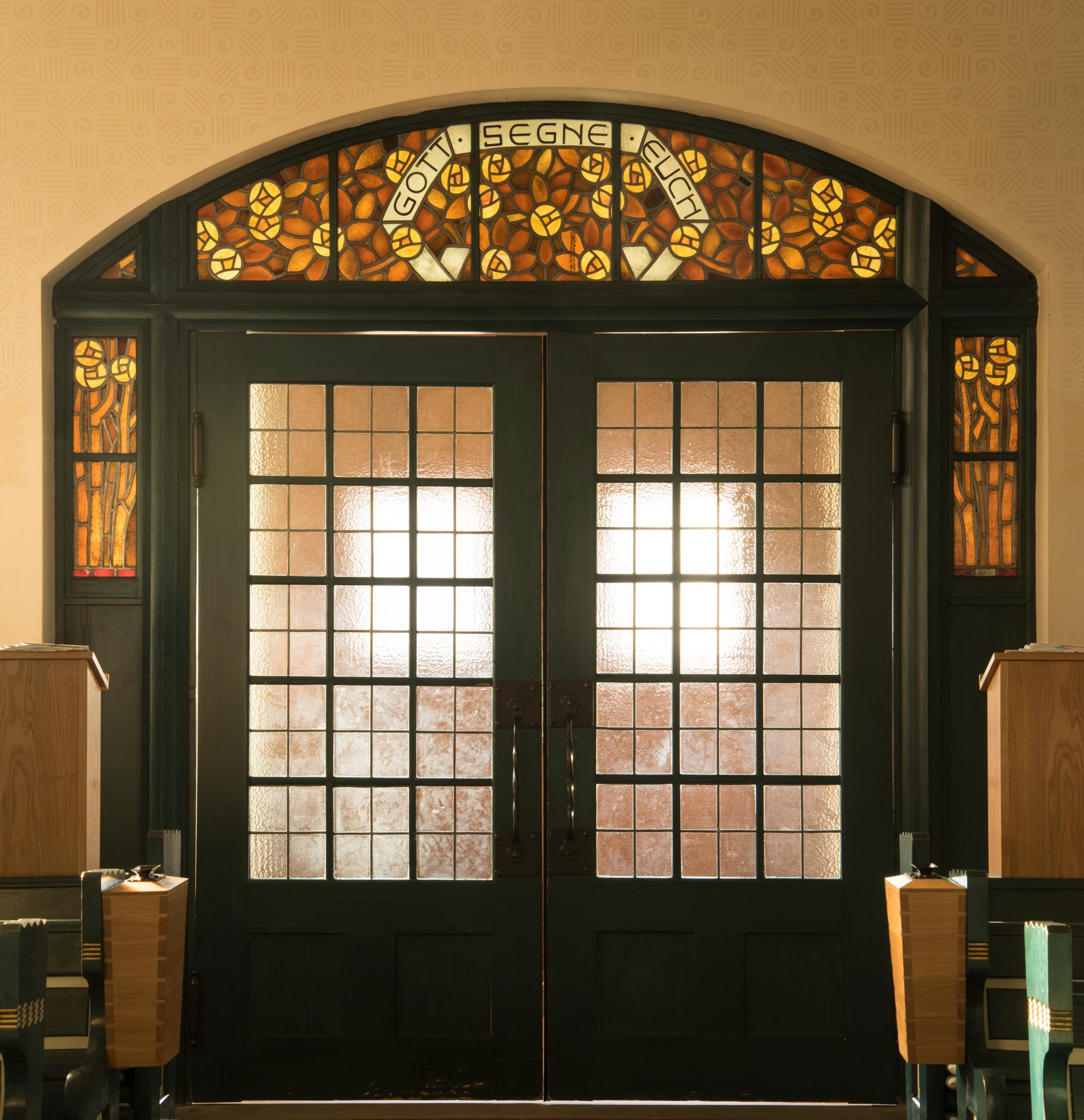 Oberhalb und seitlich der Tür angebrachte Verglasung mit einem Jugendstilornament aus Ästen, Blättern und Blüten in Braun- und Gelbtönen. Mittig über der Tür Inschriftenband.
