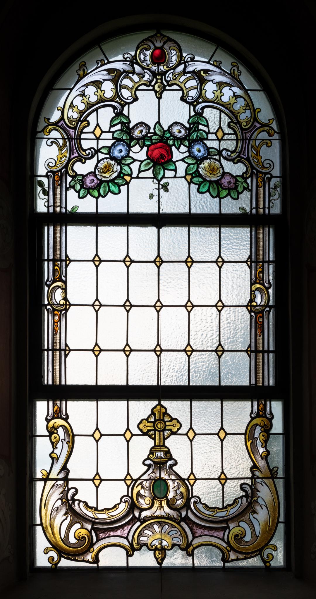 Eine Rahmung aus Rocaillen umfasst farbloses, durch Bleiruten in Rechtecke unterteiltes Glas. An den Überschneidungspunkten der Bleiruten entstehen kleine gelbe Rauten. Das Bogenfeld ist mit einer Blumengirlande geschmückt, die Rocaille am Sockel trägt ein Kreuz.