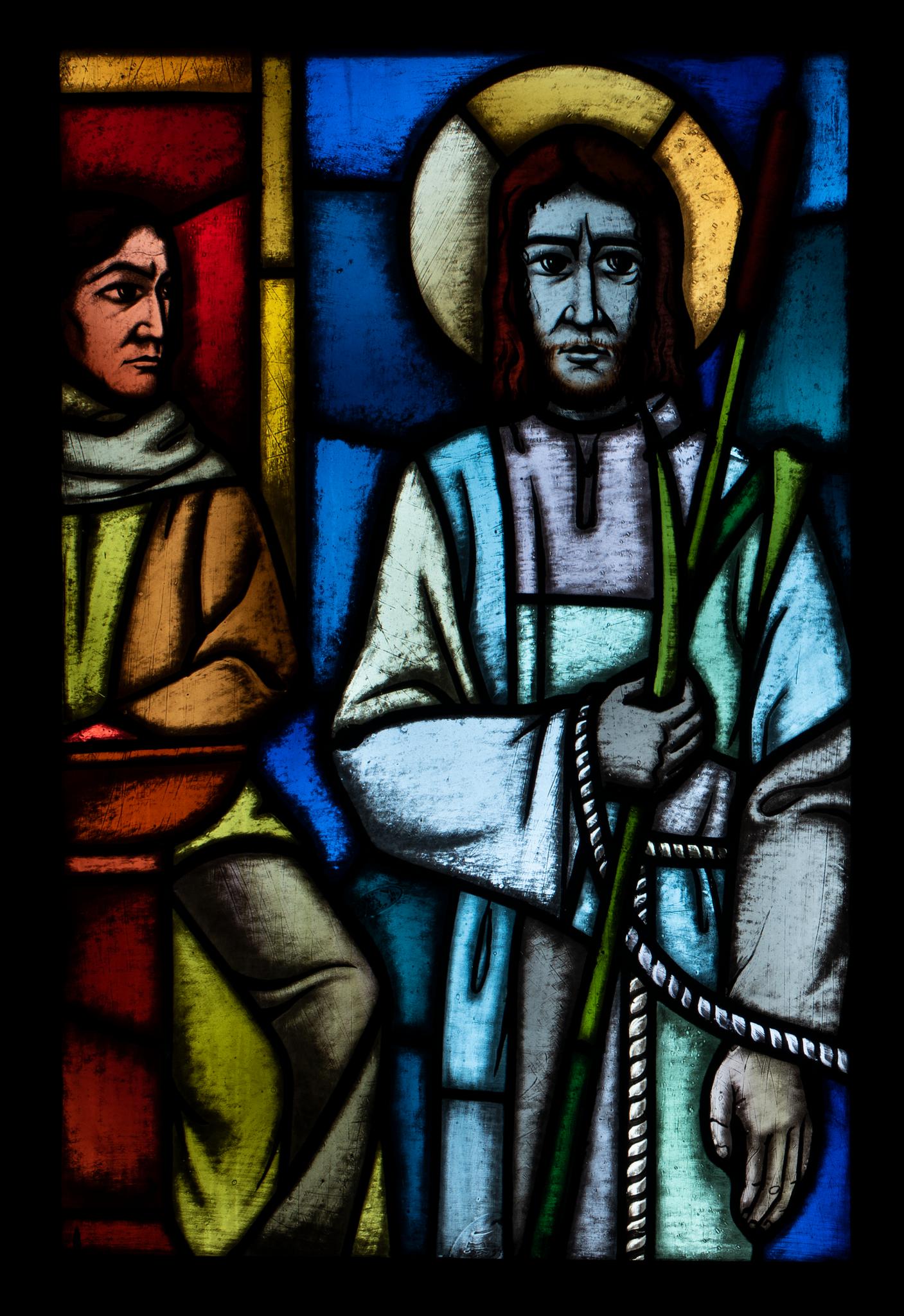 In vierzehn schmalen, in farbige Rechtecke gegliederten Rundbogenfenstern ist ein Kreuzwegzyklus dargestellt. Die Intensität der Farben nimmt nach unten zu. Links wäscht Pilatus seine Hände, rechts steht Christus mit dem Schilfrohr als Szepter.