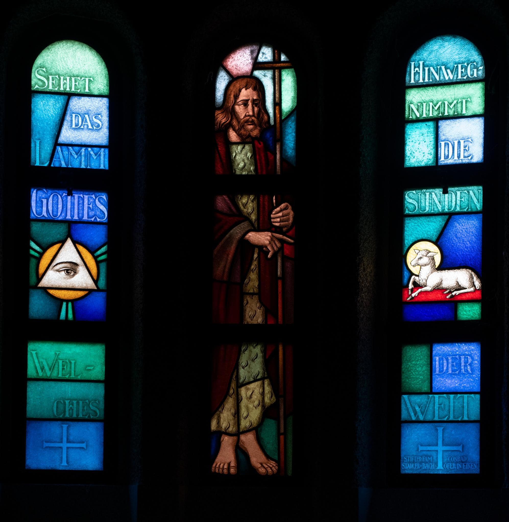 Drei Rundbogenfenster. In der Mitte steht Johannes der Täufer, zu seiner Rechten ist das Auge Gottes, zu seiner Linken das Lamm Gottes dargestellt.