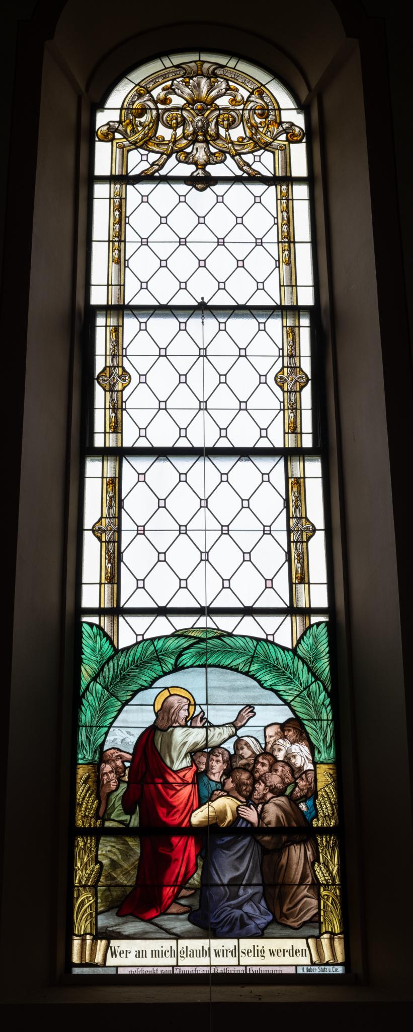 Rundbogenfenster mit Blankverglasung (Rauten mit kleinen Rechtecken an den Kreuzungspunkten) und figurativer Malerei mit Jesus als Prediger im unteren Drittel. Als Rahmung und im Bogenfeld grau und gelb gefasste Rocaillen, zuunterst Schriftband. Der segnende Jesus ist in einem roten Umhang im Kreis einer Menschenmenge gezeigt. Die Szene wird von Ähren und Palmwedeln gerahmt.