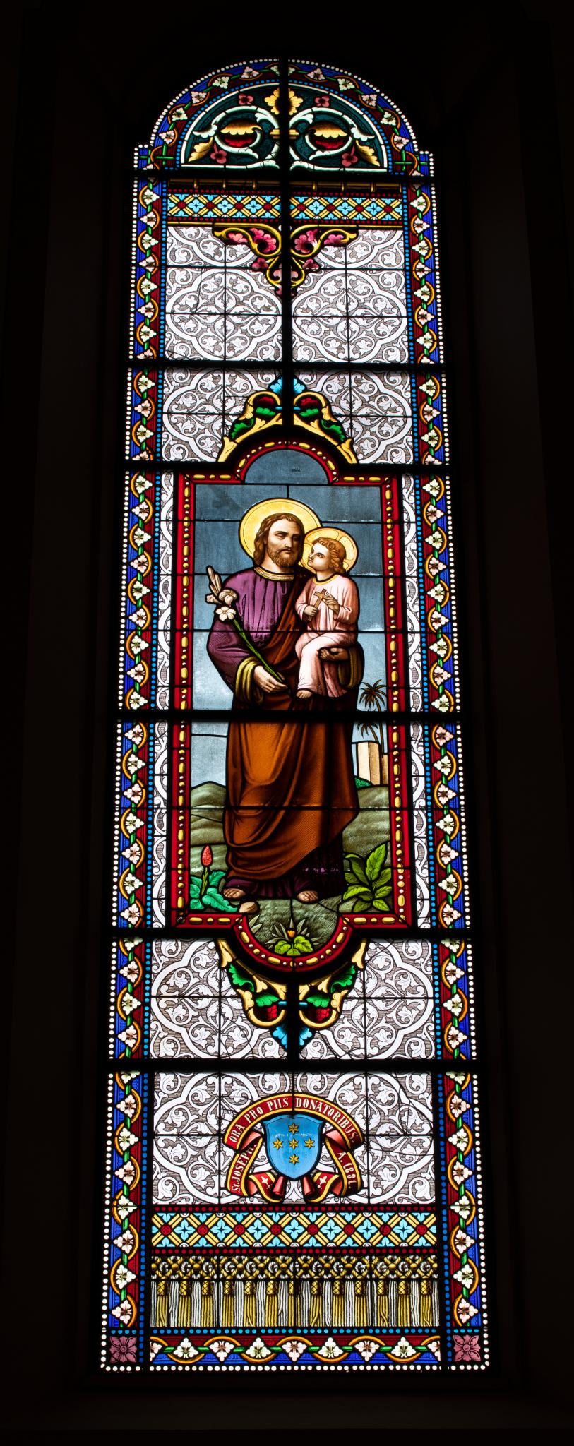 Rundbogenfenster mit einer Kartusche mit dem hl. Joseph, der das Jesuskind auf dem linken Arm trägt und eine weisse Lilie in der rechten Hand hält. Der Hintergrund ist als aufgehängter Teppich mit einem sich wiederholenden Grisaille-Ornament und farbigen Randborten gestaltet. Unterhalb der Figurenkartusche ist ein Wappen mit einem Schriftband gezeigt. Farbige Rand- und Bogenfeldverzierungen.