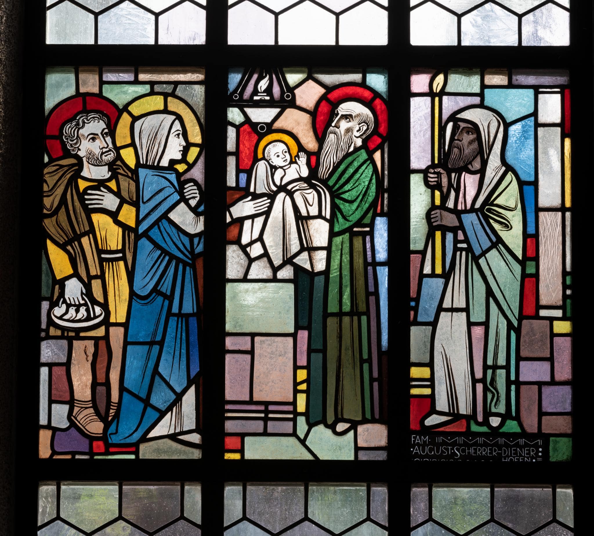 Maria und Joseph kommen nach Jerusalem in den Tempel zur Reinigung Marias und zur Darbringung des Jesuskindes. Sie stehen zur linken Seite, Josef hält zwei für das Reinigungsopfer bestimmte Tauben in einem Korb. Der Prophet Simeon hält das Kind in einem Tuch in die Höhe und bringt es, dem Ritus gemäss, Gott dar. Hinter ihm steht ein Priester mit einer Opferkerze in der Hand.