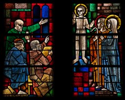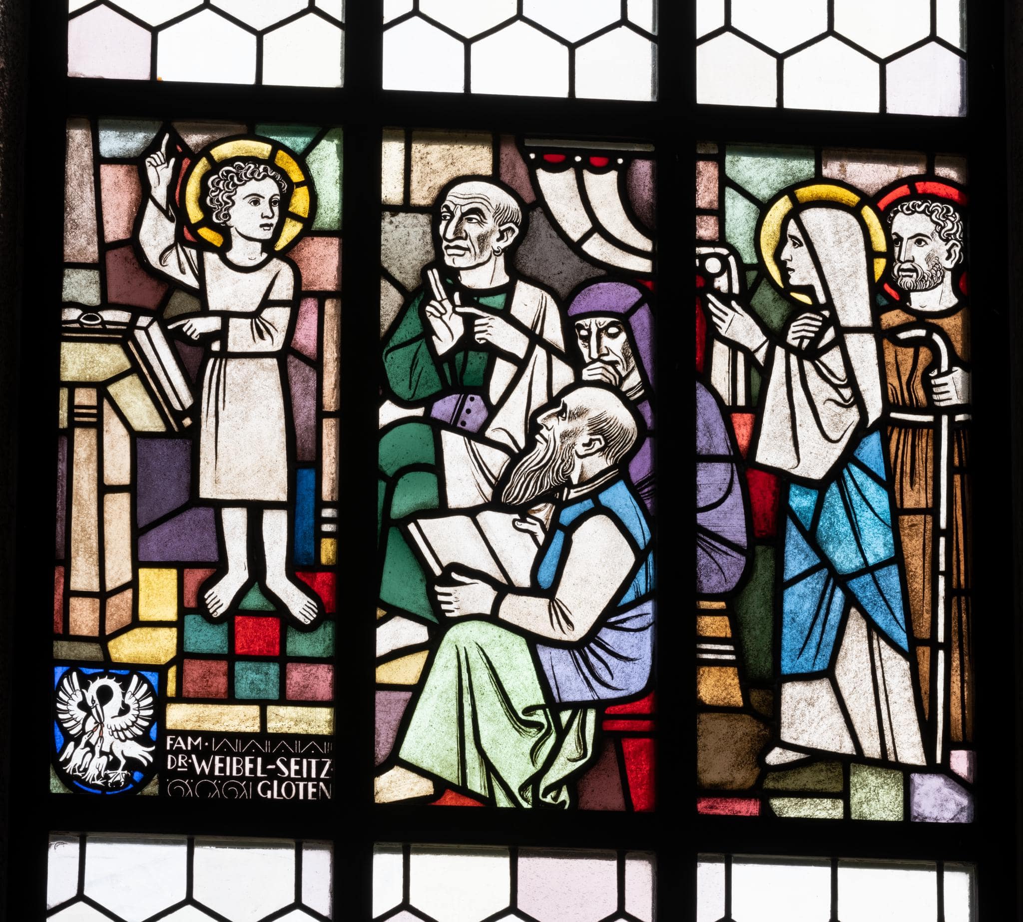 Links steht der zwölfjährige Christus im Tempel, rechts befinden sich die Schriftgelehrten, mit denen Christus diskutiert, und dahinter Maria und Joseph, die ihren Sohn aus den Augen verloren hatten und ihn nun wieder finden.