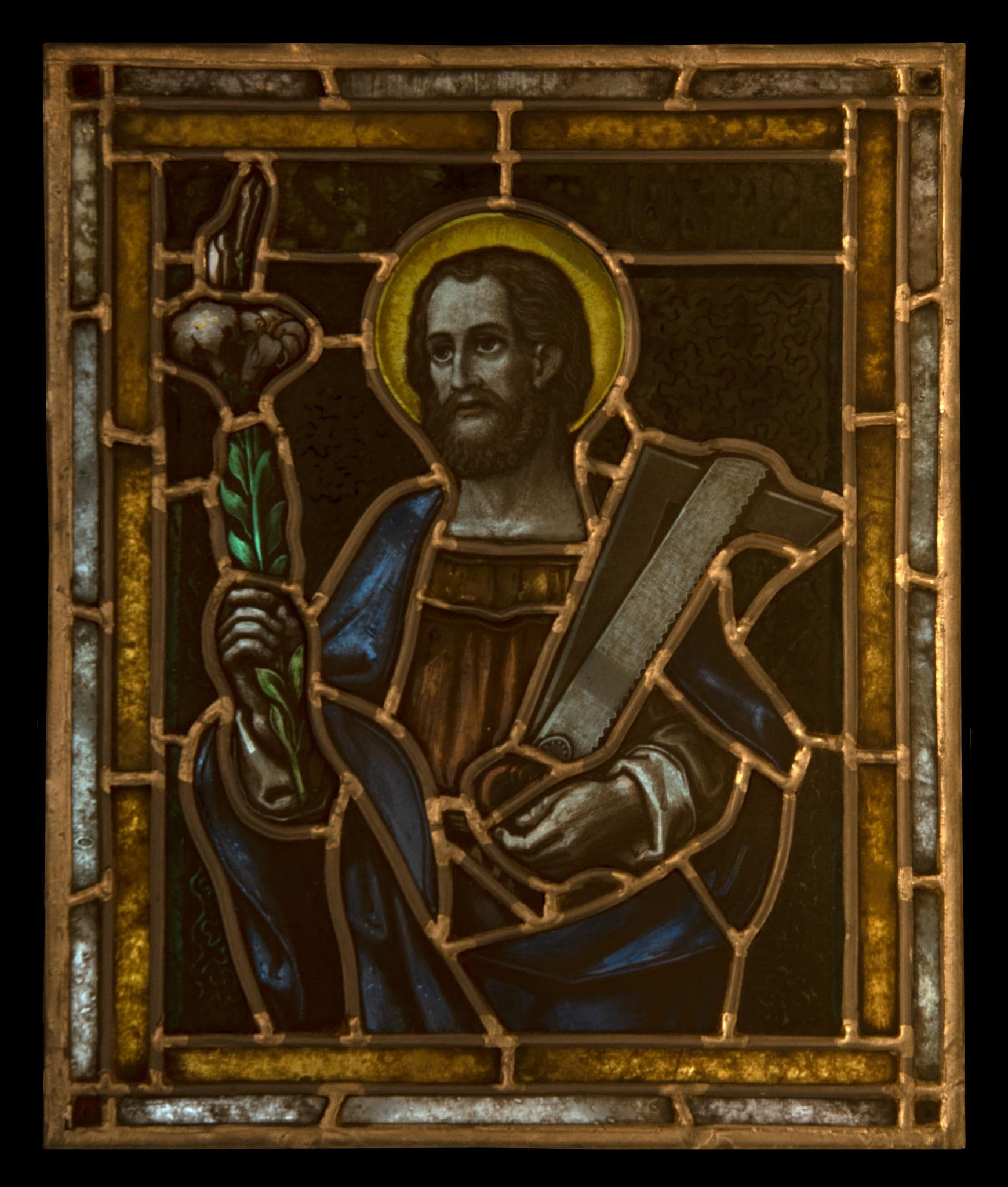 Glasmalerei-Türfüllung mit der Halbfigur des heiligen Josef in einem gelb-weissen Rahmen. Der Heilige ist mit den Attributen Winkel und Säge sowie einer weissen Lilie dargestellt.