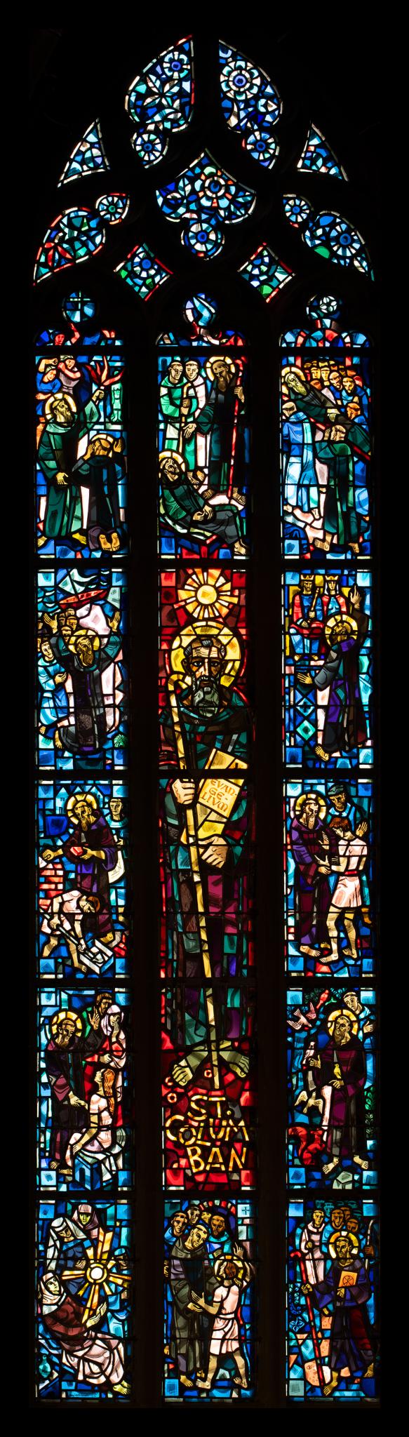 Dreilanzettiges Masswerkfenster in Blautönen. In der Mitte steht der irische Wandermönch und Missionar Columban (540–615), um ihn herum sind Szenen aus seinem Leben dargestellt.