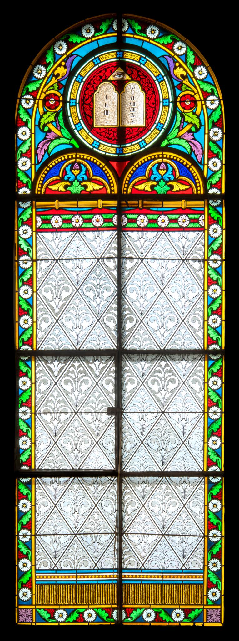 Insgesamt stellte Berbig zehn Rundbogenfenster für Chor und Schiff sowie ein quer gelagertes Westfenster her. Die sinnbildlichen Darstellungen von “Gesetz” und “Evangelium” in den beiden Medaillons der Ostfenster verweisen auf das alte Testament (Gesetzgebung durch Mose am Berg Sinai) und auf das neue Testament (Botschaft von Jesus Christus). Die sich im Schiff gegenüberliegenden Ornamentfenster sind jeweils identisch gestaltet.