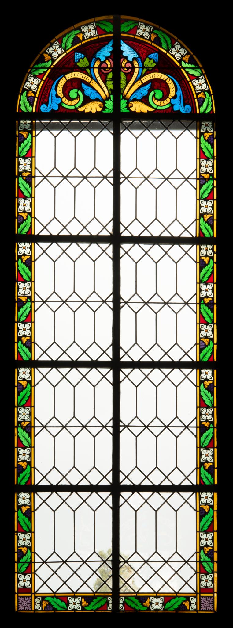 Rundbogenfenster mit Schweizerrauten in Blankverglasung; bunte Randverzierung mit Blumen und Blättern sowie Bogenfeld mit pflanzlichen Ornamenten, in den Farbgen Grün, Blau und Gelb.