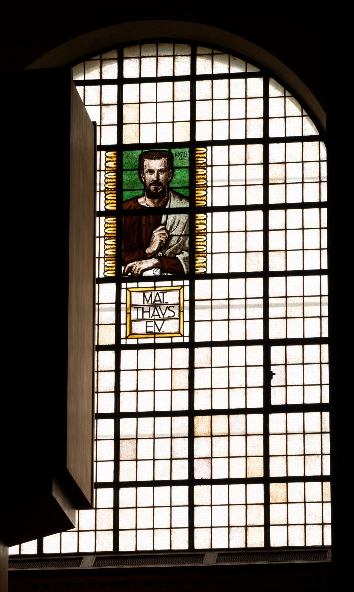 Grosses Rundbogenfenster mit blanker Rechteckverglasung, dessen Mitte ein Brustbild des Evangelisten Matthäus mit Schriftrolle ziert. Der Evangelist erscheint vor grünem Hintergrund, seitlich des Bildes verlaufen gelbe Ornamentbänder mit stilisierten Blättern, darunter ist der Name des Evangelisten in einem gelben Rahmen wiedergegeben.