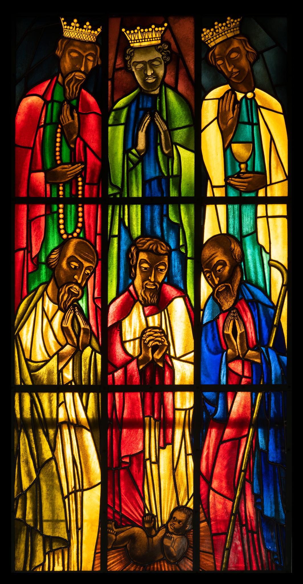 Hochrechteckiges, neunteiliges Fenster mit der Darstellung der Anbetung des Jesuskindes durch die Könige und Hirten. In der hinteren Reihe (oberes Register) sind die drei bekrönten Weisen aus dem Morgenland gezeigt, in der vorderen Reiche (mittleres und unteres Register) die drei Hirten, zu deren Füssen das Jesuskind liegt. Alle Figuren sind in Gewänder und Mäntel in verschiedenen Farben gehüllt (Blau, Rot, Gelb, Grün) und neigen ihre Köpfe andächtig dem Jesuskind im Strahlenkranz zu.