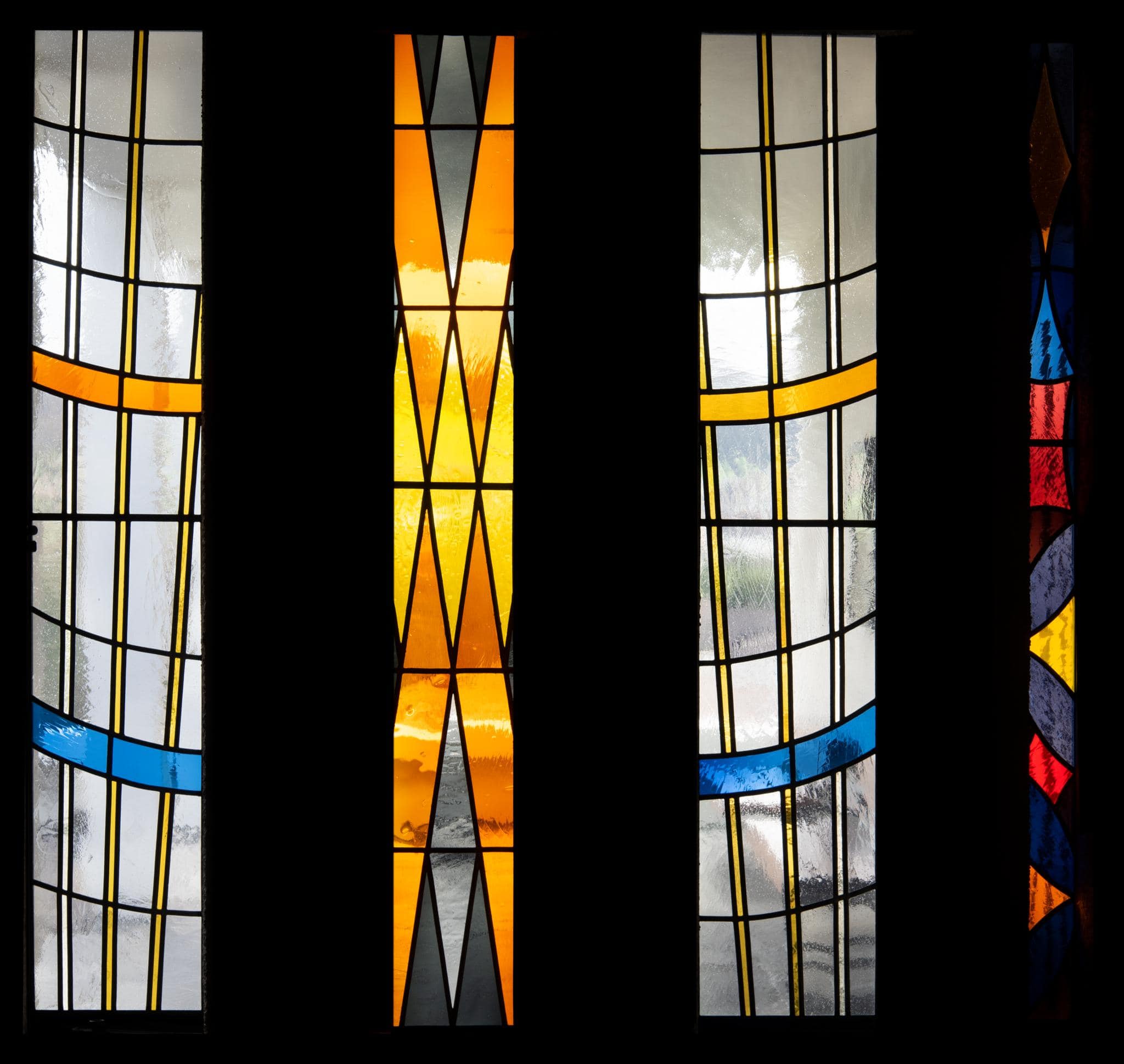 Vierteilige Fensterwand mit hochrechteckigen Scheiben. Abstrakte Glasmalerei.
