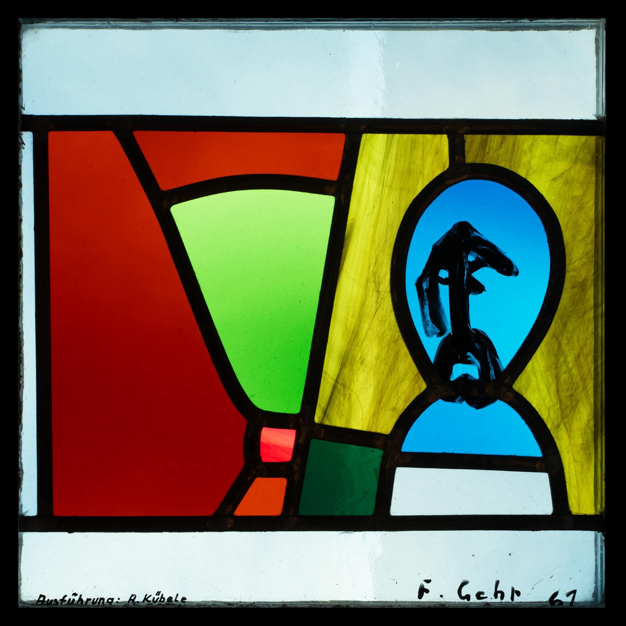 Abstrakte Glasmalerei. Rechts ist ein Gesicht mit leidendem Ausdruck dargestellt.